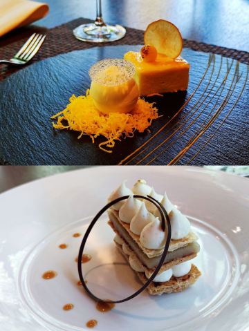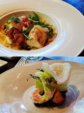 烟熏三文鱼配黑麦包,虾及蟹肉开放式三明治,比目鱼牛尾洋葱,免治肉碎配煎蛋及木耳,龙虾汤,拿破仑蛋糕,焗饭,非洲鸡,葡式海鲜饭,腌三文鱼配黄瓜,面包篮,柠檬芝士蛋糕,热情果忌廉布甸,葡国鸡,马介休球,海鲜汤,蜜糖蓝纹芝士火腿菠菜色拉,杂莓大黄挞配焦糖雪糕,煎鲈鱼