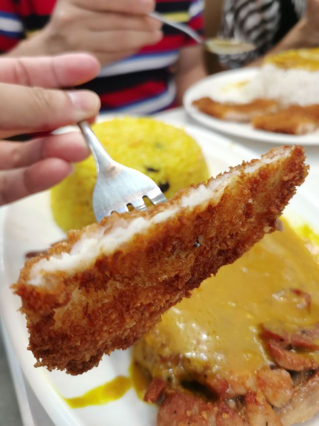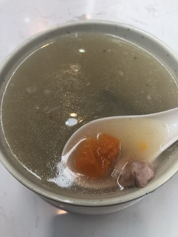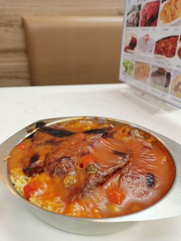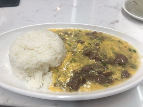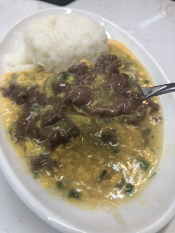 店内供应的餐品还挺多的,各类焗饭、炒饭、面类,下午茶点小吃,餐牌就好几页。例汤味道可以,还有几块胡萝卜和碎肉。滑蛋牛肉饭,咸淡味的还不错,似乎淀粉做的滑蛋汤汁有点儿多,感觉像浓稠的鸡蛋汤。不过,拌米饭吃还挺下饭的。