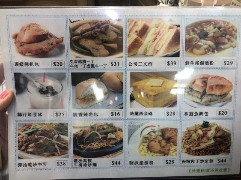 云吞面,猪扒包,猪扒扭扭粉,双蛋叉烧饭,干炒牛河,姜葱茸鸡扒捞面,奶茶,鲜牛肉蛋三明治,雪菜肉丝米,豉椒牛肉炒河,鱿鱼菜,肉酱意面,猪扒面