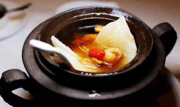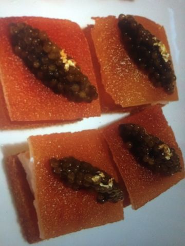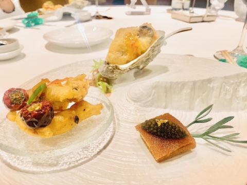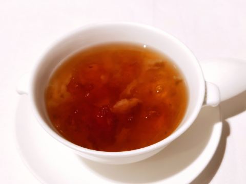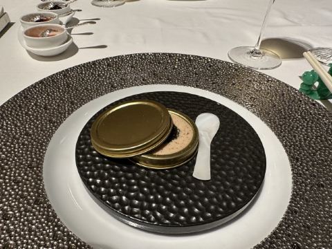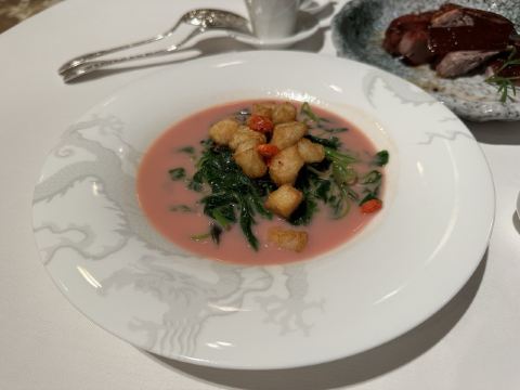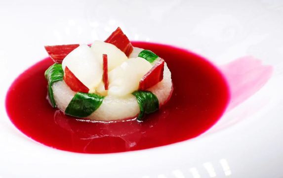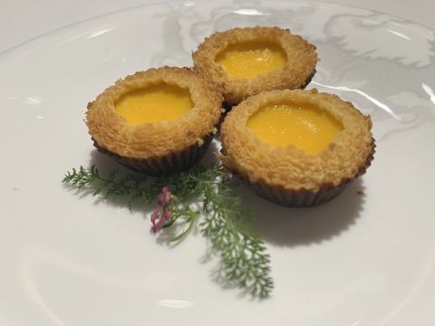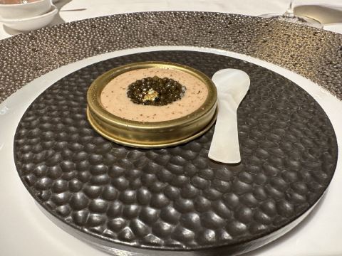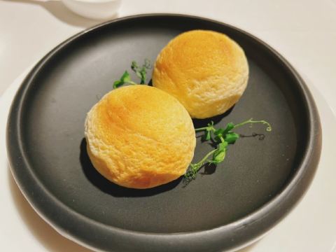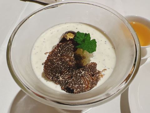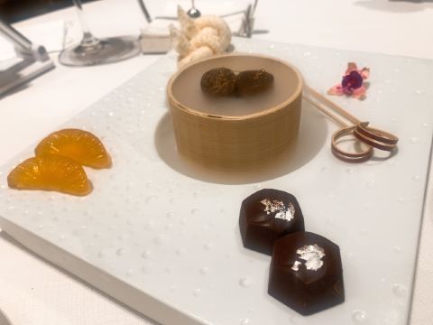 蓝莓奶油冻澳门米其林三星,誉珑轩 1.酥炸炸法国吉拉多生蚝、日本毛蟹灌汤包、蜜汁叉烧为一个组合,生蚝和叉烧表皮脆的口感很好。 2.鲜虫草石斛炖花胶,两大片肥厚的花胶美容养颜。 3.花雕蛋白蒸龙虾球,造型好看,口味清淡,蛋白是进口的有机蛋白。 4.火焰日本A5和牛粒,配有葱白解腻,和牛品质一流。 5.金花白玉翡翠,冬瓜盏里面有花胶、西班牙火腿,外面浇上红菜头做的汤汁,味道和口感层次明显。 6.誉珑轩炒饭,算是一个特色,先用香茅草、各种香料混合鸡汤煮干饭,米饭冷却后加日本小虾米、扇贝、青豆角粒一起炒,米饭颗粒分明,味道很香,青豆角和虾米口感也不一样。 7.甜品麻蓉芝士木糠布甸,我感受不出这个里面是什么主料,但是混合了爆米花、琥珀桃仁、薄脆等丰富口感的东西,类似奶油的东西我不敢多吃。