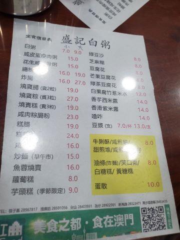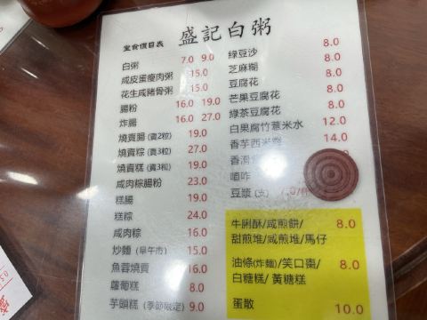 芒果双皮奶,白粥,萝白糕,豆腐花,肠粉,鱼茸烧卖,咸皮蛋瘦肉粥,炸肠,油条,鱼蓉烧卖,萝卜糕,双皮奶,芝麻糊,牛脷酥,咸肉粽,抹茶豆花,芒果豆腐花,炒面