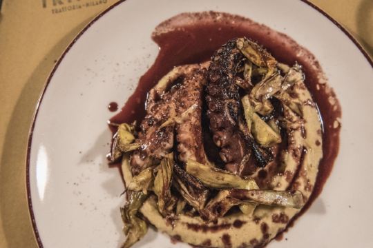 摆渡修行米兰最后几天去尝了内脏特色料理,几道菜下来,好吃的简直是捡到宝了。 餐厅非常的热闹,一开始没预约上,后来被通知正好有一组临时取消了才有了这位。不一会就全被预约的食客给坐满了。 - Trippa Fritta:炸牛肚,这也太好吃了,香脆油香味,嘴里还有牛肚一丝丝的质感,老板!再来1盘,佐酒佳品啊! - Trippa di Baccalà:盐腌鳕鱼胃,两人都是第一次尝试。口感奇特,软中带粘,一点不腥,味道不错。 - Risotto con Vinagre de Jerez e Lardo:雪莉醋烩饭配猪肥膘再撒了些罌粟籽,需要两人起点。酸酸的口味让整体配着猪肥膘的烩饭不会太腻,肥肉味其实不重,因为连喵喵这种不爱吃肥肉的都把一整盘都消灭了。 - Turcineddi:羊杂,记得是肺和肝?朋友说很tasty,不要问喵喵...不敢尝,我连羊肉都不吃,更不用说羊杂了。 - Polpo:章鱼煎的好嫩啊,量也太足了,三大条啊!配着洋蓟和土豆泥,酱汁味道咸度正好,章鱼的话稍微有一点油,不过想说这土豆泥咋那么好吃呢!心里呐喊“土豆大国德国,请好好学学。” - 提拉米苏:超多奶油,质感有些像whipped cream(中文叫掼奶油?打发后奶油?)一样比较轻,下面的饼干都是已经浸透咖啡,最下层还铺着脆脆的饼干之类的。本来和胡子说好了一半一半,最后因为太好吃,就分了一小口,入口即化,creamy浓郁但不会觉得厚重。 - 芝士蛋糕:其实也挺不错的,但是和提拉米苏比起来就稍逊色了。 价格的话,前菜+第一道主菜+第二道主主菜+甜品,40欧左右/人不含饮品,感觉还是很实惠啊。