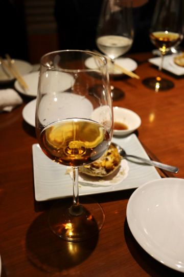 摆渡修行一家会用达摩正宗的中国料理蟹的店。 蟹特别好。很新鲜,很肥厚。店家细细地把蟹肉都剥了出来,码在蟹壳里,(我做梦都不敢想有这种好事。)浇上黄澄澄的蟹黄和蟹膏,再淋一点姜丝酱油,吃的时候,用勺子kuǎi着吃。 蟹黄油脂饱满,肥厚膏腴,蟹肉细嫩香甜,配一口甘醇柔和的古酒,酒的鲜味和蟹的鲜味儿融在一起——绝了。 ………就是吃起来有点快。 重点说完了,说说这家的餐酒搭配。 日本酒和中餐怎么搭,真是一个令人挠破头皮,又不得不解决的问题。 故事的开头,是@林萍在日本 小姐姐拿这家店诱惑我,说是一个很懂日本酒的朋友安利的。我一看,嚯,用达摩正宗的古酒来搭上海蟹,这事我想干好久了!! 跑去问了达摩正宗的白木小姐姐,她说知道这家店,店主的夫人非常懂酒,是很厉害的行家。我就蹦蹦跳跳的去了。 同行的日本大哥也非常懂酒,点餐+点酒,循序渐进,非常利落妥帖。 先上了口水鸡,是日式的做法,鸡肉很嫩,酱汁清澈干净,微辣。配上一点焦香的白芝麻和香菜,很开胃。之后又上了清爽的海蜇和小葱皮蛋拌豆腐。 这几道搭的是「一代弥山」,是一款香槟口感的气泡清酒,味道酸甜清爽,喝起来有桃子和柑橘的芬芳,度数很低,很适合做餐前酒。 之后上了热腾腾的蔬菜小炒,爽脆的韭菜,有点肉感的茭白,略带一点虾蟹的调味。配风之森的雄町,无过滤无加水,精米步合80。 精彩到快要拍案而起了。 雄町的酒米,加上低精白,在风之森新鲜清爽的基础上,增加了一点醇厚浓郁的风味,很适合配小炒了。 然后是烤鸭卷和蜜汁叉烧。 做得很好,一点也看不出来是日本的餐馆。叉烧尤其甜蜜肥美,就像我一样。配的是極上ノ斬,这是我第一次喝岩手县的酒,爱上了。 扒过来看一眼瓶签儿。「山田锦」,「高精白」,「冰温熟成」,「袋吊」,每多看一个字,脑子里的计价器就翻一翻。酒是真的好喝,味道清澈,米香迷人,入口即逝。不抢味,又不会觉得过于寡淡。 最后是蒸鱼,和虾肉海鲜小炒饭。 在这边吃到蒸鱼的感动真是难以言喻,我没有办法正确的评价了。炒饭倒是很棒,有劐气,粒粒分明,海鲜弹牙,好吃又不会觉得油腻。 搭的是「高清水加温熟成解脱酒」,这款酒也是我第一次喝。一顿饭骗两瓶没尝过的酒,也太开心了!