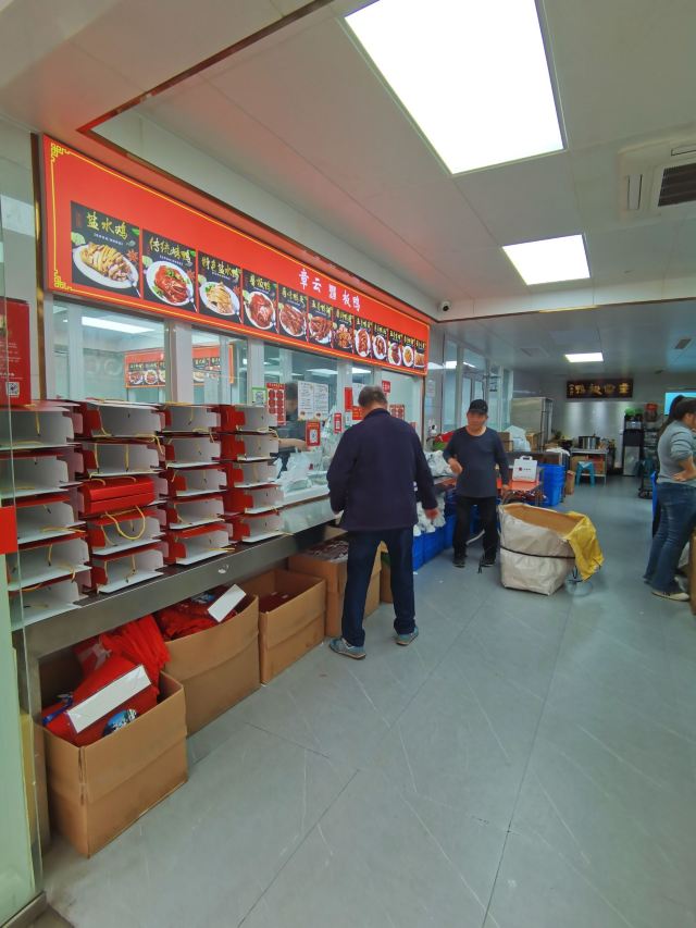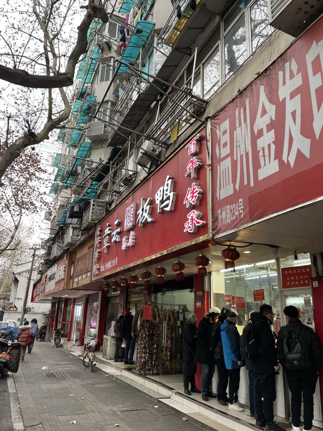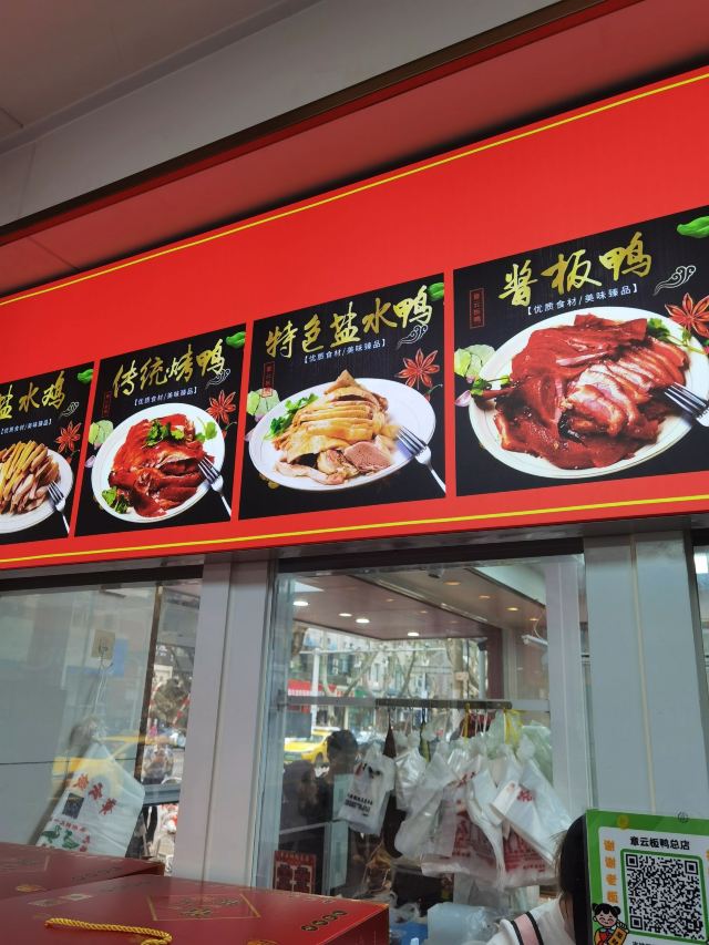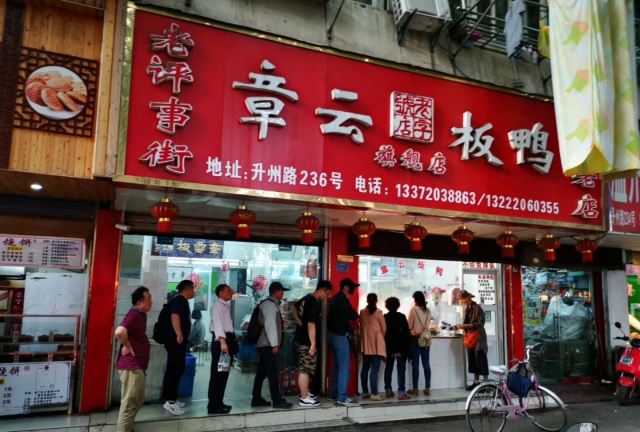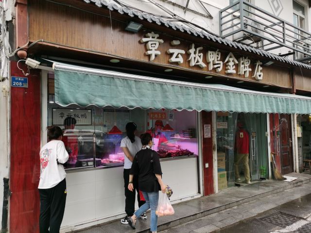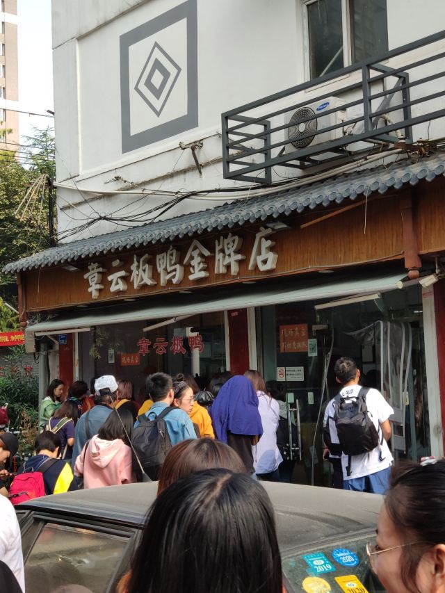 章云板鸭创于20世纪70年代,原先在升州路202号,2013年往西挪动了约150米,搬到了现址,店面和大多数熟食店一样,没有堂吃的地方,顾客总是在窗口外大排长龙等待打包带走,好在师傅手脚麻利,速度也还算快。 鸭肉类食品是南京特色美食,章云板鸭价格公道,味道超棒,烤鸭是蘸卤汁吃的,皮脆肉香,盐水鸭鲜嫩,没有鸭膻味,关键他家可以现场切好鸭子,再现场进行真空包装,使鸭子吃口更新鲜,带回家自己吃或者送人皆宜。