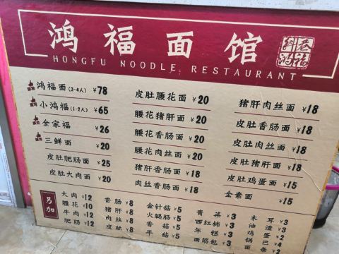 全家福,小鸿福,三鲜面,皮肚香肠面,皮肚猪肝面,赤豆元宵,皮肚面,小鸿福面,大肉,皮肚,三鲜加油渣,香肠皮肚面,香肠猪肝,皮肚腰花面,猪肝,虎皮蛋,肉丝猪肝面,糖芋苗,猪肝面,肉丝香肠,肥肠,香肠,香葱炸酱面,油渣,牛肉,皮肚大肉面,鸡蛋,火腿肠,腰花,肉丝,豆奶