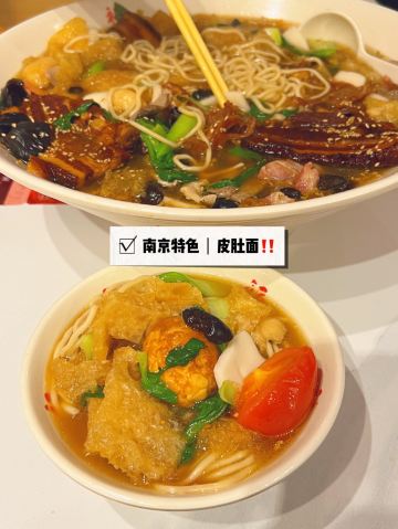 jane猫小喵✅鸿福面馆有年头没去了,不过只要到南京,这家店是必去的,发现店铺搬迁到原址不远处下沉式的沿街店铺,装修比原先有格调了,原木桌椅看着很温馨,收拾也干净。 - 🌈小鸿福(2人份)66.8元▶️估计也是好久没去了,❗️居然又在原本十二三种配菜的基础上加了火腿、肉皮、木耳、年糕,去端的时候,才发现整个面碗堪比洗脸盆。 - 🌈 在南京,万物皆可皮肚。 - 💢 配菜真的超级多!🈶️ 青菜、木耳、皮肚、香肠、火腿肠、年糕、鹌鹑蛋、猪肝、肉丝、面筋壳、 大肉等,汤底鲜美,但不是那种喝完口渴一下午的那种鲜美。面条是那种圆滚滚的碱面,是老南京们喜欢的呛面,吃到最后都没有变得软烂,真是超喜欢💯。 - 🌈南京人的皮肚面,关键在皮肚,灵魂是辣油。 🌈吃的时候加一点店家熬制的辣油,吸满的汤汁从每个孔里迸发而出,弹脆香辣,紧实爽脆,问鼎皮肚的高光时刻‼️