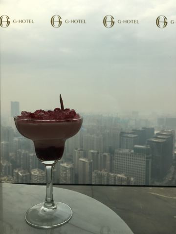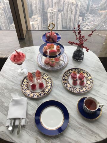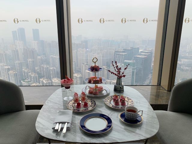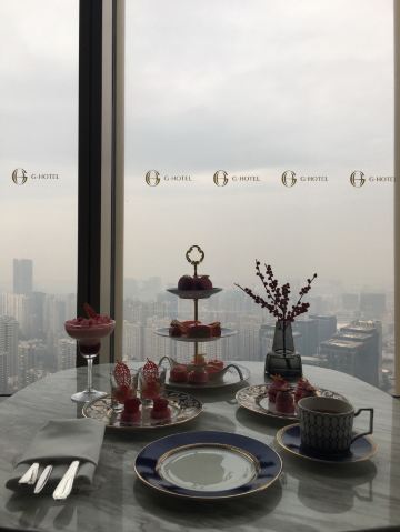 金鹰世界GHOTEL·天际酒廊 金鹰世界GHOTEL大堂吧 50楼 听说是网红下午茶 景色不错 可有几套供选择 也会有特别款 预订了天际下午茶 全粉色系列 分含酒精与普通单品 品相不错 餐具也很搭 服务员很有礼貌 口味一如既往的齁甜 还有含着酒精的齁甜 不过鉴于大家都一个水平也就不纠结了 只有烟熏玫瑰三文鱼还算不错 其余太耐吃 聊天的不错地