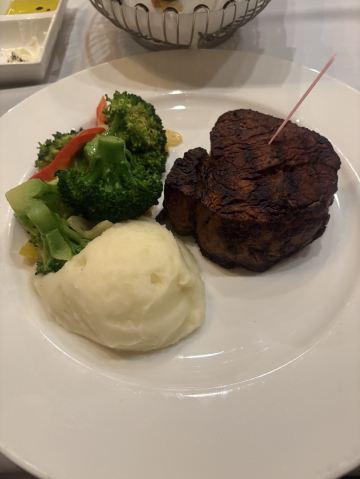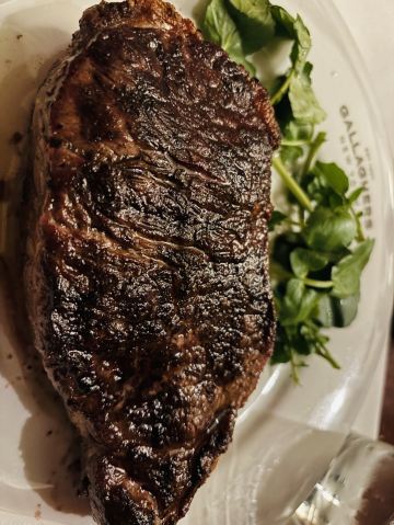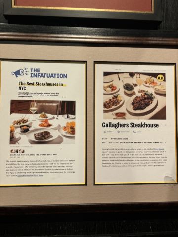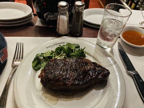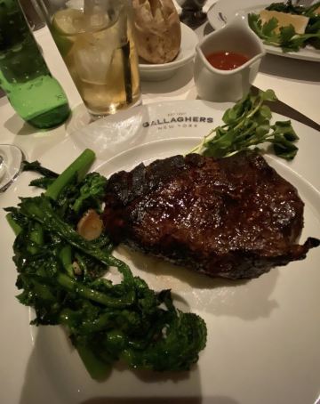 Gallagher’s Steakhouse NYC这家牛排店也是躺在收藏夹中许久了 于是刚好趁着餐厅周期间,来打卡 店面入口右侧便是一间牛肉熟成室 琳琅满目的干式熟成牛肉看着太诱人了 店面画风也是较复古的经典美式风格 虽是周内午餐前来,店面也是满满的人 店员也是绅士的老爷爷们,很有电影感 ✨Manhattan Clam Chowder✨ Clam Chowder遇番茄汤底的神奇搭配 还是首次遇到,上桌的当下有些震惊 入口开始有些不习惯,喝到后面感觉还不错 汤也是温温的,不过蛤蜊吐沙不是很干净 ✨Soup of the Day✨ 当日是蟹肉番茄冷汤,还是不太习惯冷汤 两款汤品,更喜欢Clam Chowder ✨Sliced Filet Mignon✨ 餐厅周的午市套餐有这道牛排,无需加钱 选了Medium Rare,熟度与味道恰到好吃 搭的酱料有些重口,直接吃牛肉的原汁原味 就这配菜的炒蘑菇一起,风味口感会更佳 ✨Lamb Chops✨ 加$18可以升级到小羊排,一份有3个 本次的C位肉肉,Medium熟度很嫩 有腌制入味,搭配奶油菠菜和土豆泥 一口下去爆汁,而且很新鲜,没有膻味 相比主食,甜品没有太大的惊喜感 搭配了冰淇淋,一口冰爽很是解腻 ✨NY Style Cheesecake✨ ✨Ice Cream✨
