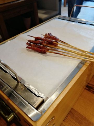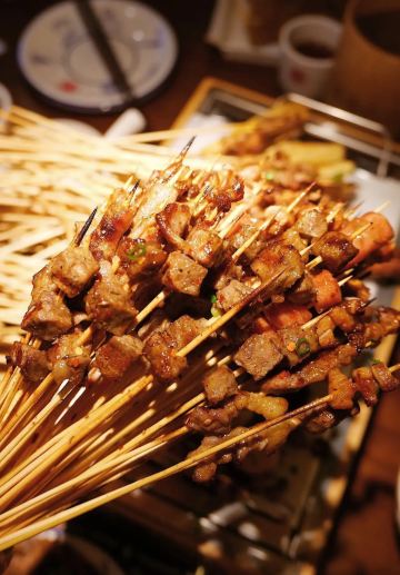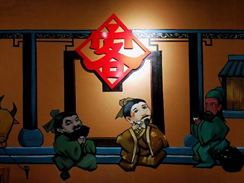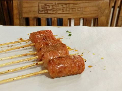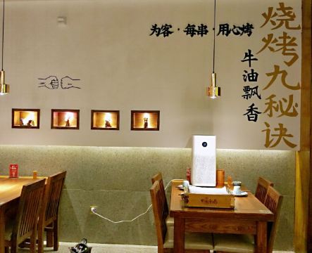 反客为主,串出精彩。 正所谓“人生如戏,全靠演技。” 张艺谋在其导演的《有话好好说》中客串一个收破烂的,一句“安红——鹅想你!”成就经典画面; “我见过穿的最多的车模”张莉馨亦是如此,短短几分钟的客串车模,使其红透半边天。 因此“客串”出品,亦可点赞。 这家餐厅位于由宁波亚力山大置业有限公司开发的钱湖天地商业中心腹地,相邻田波泡椒牛蛙和D Sky Home,门前摆放了几辆小型卡丁车,供顾客免费游玩。 入内,正对着收银台,餐后微信付款,商户显示全称是宁波市鄞州中河久创烧烤店;店内有无线,WIFI密码是88008833;餐厅装修中西贯通,乍看质朴,内含别致,墙绘简洁逼真,三国题材萌感十足;每张桌子上都摆放有签桶、水壶、餐具和续温的恒温器。 做为我们人类最原始的烹调方式----烧烤,在长达数千年的历史更迭后,演变出了糊泥烤、挂糊烤、钩吊烤、篝火烤等形形色色的烧烤方式,且各地又有自己独特的食材而形成的烧烤风格,因此,我认为不管是那种模式,能呈现给食客鲜美的食物才是最好的方式。 说到这“苗夷化外之境的湘西小串”和“纳三湘四水的岳阳烧烤”,“牛油、黄喉、掌中宝”是必不可少的食材推荐,餐厅的黄金牛油20元/手(20串),这牛油取自黄牛胸尖的一丁点脂肪,烤炙火候很关键,色泽金黄,外焦脆内饱满,一口一串,乃至数串,体味浓郁油脂香混合焦香、奶香味四溢的多重满足感,难怪有人说“一串正宗、好吃的牛油,是评判一家湘西烧烤店是否正宗的唯一标准。” 老宁波牛肉砂锅18元,一碗热腾腾的砂锅,足以抵御寒气凛冽的冬夜,尤其是这样一碗漂浮着油豆腐、葱花、粉丝、青菜和牛肉,色泽酱红的砂锅。 阿婆凉糕(甜点)10元,蓝纹瓷碟、瓷碗、瓷调羹,古风满满,花生碎、白芝麻的存在,丰富了凉糕的硬度和咀嚼感。