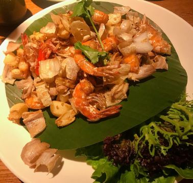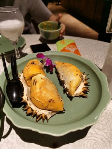 BANANA LEAF对于蕉叶,已无需赘言,一杯香槟开启视觉与味觉的盛宴 橙香山药,一开始以为是芒果,吃了才发现是山药,用橙汁浸泡过,平淡的山药吸收了橙子的酸甜和香味,清爽开胃,相当不错,推荐 红酒腌牛肉,牛肉嫩而入味,酒味不重,味道不错 曼谷青木瓜沙律,之前也吃过,比较清爽的,这次的沙律汁调的太辣了点,有点盖过青木瓜爽脆的口感 香麻手撕鸡,不同于白斩鸡的味道,鸡肉香嫩不腻 香芒大虾沙律,偏水果系的沙律,大虾很新鲜,对半劈开与水果拌到一起 椰青、椰皇,很具代表性的饮品,原汁原味,椰青口感更加清甜一些,椰皇则甜度更高一点 招牌咖喱皇炒青蟹,招牌菜,代表性的咖喱的味道,百吃不厌,与泰国香米饭拌在一起,人间美味,青蟹过了一下油,壳很脆,比较容易咬,大钳子服务员会帮忙弄开,很贴心 秘制冬阴功虾汤,超级喜欢冬阴功的味道,里面加了香茅、南姜等泰国各种香料,酸辣,又带点椰奶的香甜,特别开胃 金牌碳烧猪颈肉,也是招牌之一,肉质脆嫩,蘸上一点酱,甜而不腻 皇牌马来咖喱牛腩,不负皇牌美名,牛腩软而入味,咖喱依旧好味 粉丝虾,第一次吃这道菜,再也忘不了了,粉丝吸收了酱汁的味道和虾的鲜味,真是超级好吃,下次来还点 泰式小食拼盘,春卷、虾饼、泰式炸饺都很不错,鸡肉串也比之前味道好了,鸡肉没那么柴了 青柠檬蒸富贵鲈鱼,很有特色的一道菜,鲈鱼很嫩,肉质肥美,刺也不多,因为人多,用的鲈鱼也比平时的大了一圈,上面铺满了剁椒,有点辣的,加了鱼露,比较特别的咸腥味,不过这次加的不多,味道不是很明显 泰式香草青口贝,淡菜的泰式吃法,没有像我们宁波人吃法的那么腥,反而很清爽的感觉 新加坡黑胡椒牛蛙,在外婆家吃过类似的牛蛙,不过味道和做法都有些不同,喜欢吃牛蛙的也是个不错的选择 碳烧脆皮椰香鸡,这绝对不是一般的烤鸡,应该加了椰奶,有股特别的香甜为,皮脆肉嫩,色香味俱全,推荐 招牌榴莲酥,竹屉容器和榴莲酥的造型都显心思,薄脆的酥皮和浓郁的榴莲味,不是一般餐厅可以比拟的 蕉叶松糕,比一般的紫米糕更加糯,可惜实在太饱,吃不下了 芒果布丁&火烧焦糖布蕾,蕉叶实在太有心机,在那么一大轮美食过后,还准备了如此美味的甜品,想减肥的同学请默哀,虽然已经吃的非常非常饱,但对这两个甜品还是停不下来,蕉叶旗下的芒果先生有同款在售,喜欢的同学可以去试试哦,而且价格相当实惠呢 如此丰盛,如此精彩,如此让人回味无穷