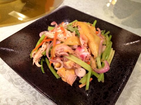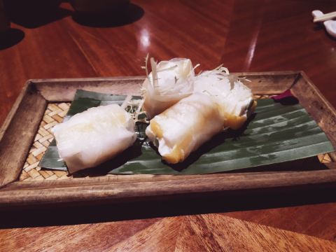 拖延小姐对于蕉叶,已无需赘言,一杯香槟开启视觉与味觉的盛宴 橙香山药,一开始以为是芒果,吃了才发现是山药,用橙汁浸泡过,平淡的山药吸收了橙子的酸甜和香味,清爽开胃,相当不错,推荐 红酒腌牛肉,牛肉嫩而入味,酒味不重,味道不错 曼谷青木瓜沙律,之前也吃过,比较清爽的,这次的沙律汁调的太辣了点,有点盖过青木瓜爽脆的口感 香麻手撕鸡,不同于白斩鸡的味道,鸡肉香嫩不腻 香芒大虾沙律,偏水果系的沙律,大虾很新鲜,对半劈开与水果拌到一起 椰青、椰皇,很具代表性的饮品,原汁原味,椰青口感更加清甜一些,椰皇则甜度更高一点 招牌咖喱皇炒青蟹,招牌菜,代表性的咖喱的味道,百吃不厌,与泰国香米饭拌在一起,人间美味,青蟹过了一下油,壳很脆,比较容易咬,大钳子服务员会帮忙弄开,很贴心 秘制冬阴功虾汤,超级喜欢冬阴功的味道,里面加了香茅、南姜等泰国各种香料,酸辣,又带点椰奶的香甜,特别开胃 金牌碳烧猪颈肉,也是招牌之一,肉质脆嫩,蘸上一点酱,甜而不腻 皇牌马来咖喱牛腩,不负皇牌美名,牛腩软而入味,咖喱依旧好味 粉丝虾,第一次吃这道菜,再也忘不了了,粉丝吸收了酱汁的味道和虾的鲜味,真是超级好吃,下次来还点 泰式小食拼盘,春卷、虾饼、泰式炸饺都很不错,鸡肉串也比之前味道好了,鸡肉没那么柴了 青柠檬蒸富贵鲈鱼,很有特色的一道菜,鲈鱼很嫩,肉质肥美,刺也不多,因为人多,用的鲈鱼也比平时的大了一圈,上面铺满了剁椒,有点辣的,加了鱼露,比较特别的咸腥味,不过这次加的不多,味道不是很明显 泰式香草青口贝,淡菜的泰式吃法,没有像我们宁波人吃法的那么腥,反而很清爽的感觉 新加坡黑胡椒牛蛙,在外婆家吃过类似的牛蛙,不过味道和做法都有些不同,喜欢吃牛蛙的也是个不错的选择 碳烧脆皮椰香鸡,这绝对不是一般的烤鸡,应该加了椰奶,有股特别的香甜为,皮脆肉嫩,色香味俱全,推荐 招牌榴莲酥,竹屉容器和榴莲酥的造型都显心思,薄脆的酥皮和浓郁的榴莲味,不是一般餐厅可以比拟的 蕉叶松糕,比一般的紫米糕更加糯,可惜实在太饱,吃不下了 芒果布丁&火烧焦糖布蕾,蕉叶实在太有心机,在那么一大轮美食过后,还准备了如此美味的甜品,想减肥的同学请默哀,虽然已经吃的非常非常饱,但对这两个甜品还是停不下来,蕉叶旗下的芒果先生有同款在售,喜欢的同学可以去试试哦,而且价格相当实惠呢 如此丰盛,如此精彩,如此让人回味无穷