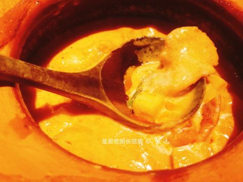 是爱吃的长颈鹿据说是宁波泰国菜鼻祖,让我们来一探究竟 将近年关,每家店里都坐满了食客,大家都和朋友或者家人共赴年前的美食盛宴。而我也和闺蜜约好了来这家我们上学时候只敢望不敢吃的店了。这家店有些年头了,每次路过都会被门前的大象所吸引,浓郁的泰国风情在勾引着我们去。 一进门就看到春节气息的大红色门联,与店内的装修交相辉映,仿佛让我置身泰国曼谷 因为人很多,我们只好乖乖的去拿号坐在小椅子上等待。等待的时候我们也没闲着,因为无聊就把菜单翻了一遍,早早的在心里敲定了要点的菜。等了大概二十多分钟,就有服务员小姐姐过来给我们送了橘子,还送了椰汁糕,怕我们饿着真的很贴心了。椰汁糕又糯又软,里面满满的都是椰奶和西米露,推荐! 招牌咖喱蟹 其实这个蟹有两个选择,可以选择青蟹或者珍宝蟹。青蟹是298一只。珍宝蟹比较贵,298一斤,可以选择大中小型,然后服务员会去称重,过来给我们看过讲下重量然后就会帮我们下单制作了。这家店的咖喱真的做的绝妙的,咖喱味醇厚,配上珍宝蟹丝丝分明的细腻蟹肉,真的美哉!蟹钳里满满的都是肉,完全不必担心不够吃呢 碳烧猪颈肉 肥瘦分明的猪颈肉,油水占3分,瘦肉占7分。这家的猪颈肉真的很嫩呢,配上特制的酱料,我太爱了!! 海鲜冬阴功汤 这道冬阴功汤并没有给我很大的惊喜,对我来说可能太酸了,里面的海鲜有一点少,还在蛤蜊里面吃到了沙子。 芒果糯米饭 我无法想象芒果椰汁和米饭的结合是怎么样的,所以我们点了一份来尝鲜。芒果很新鲜,甜糯米真的太软了,蘸上一点椰汁,吃进去第一口我的舌尖就被它点亮了,它把芒果的魅力发挥的淋漓尽致 红咖喱龙利鱼 我是个超喜欢龙利鱼的女孩阿,龙利鱼肉质细腻,卡路里低,不管是烫火锅还是放咖喱里面都很棒 笼仔糯米蒸鸡 上面一层颗颗分明柔软的糯米饭,一勺子挖下去有很多鸡肉,鸡肉用的都是鸡腿肉阿。怎么会这么好吃,一边吃一边感叹! 芒果汁 芒果汁是现榨的,浓郁醇厚,感觉都没有掺水,28的价格很值得了。 @是爱吃的长颈鹿主笔 特别夸一下穿着马里奥服装表演小哥哥小姐姐,一桌一桌表演过来很辛苦了。到我们面前还要问我们喜欢听什么歌,然后唱给我们听,在第一视角感受热情洋溢的表演。体验感和美食都很让人满足,下次还要来打卡呀
