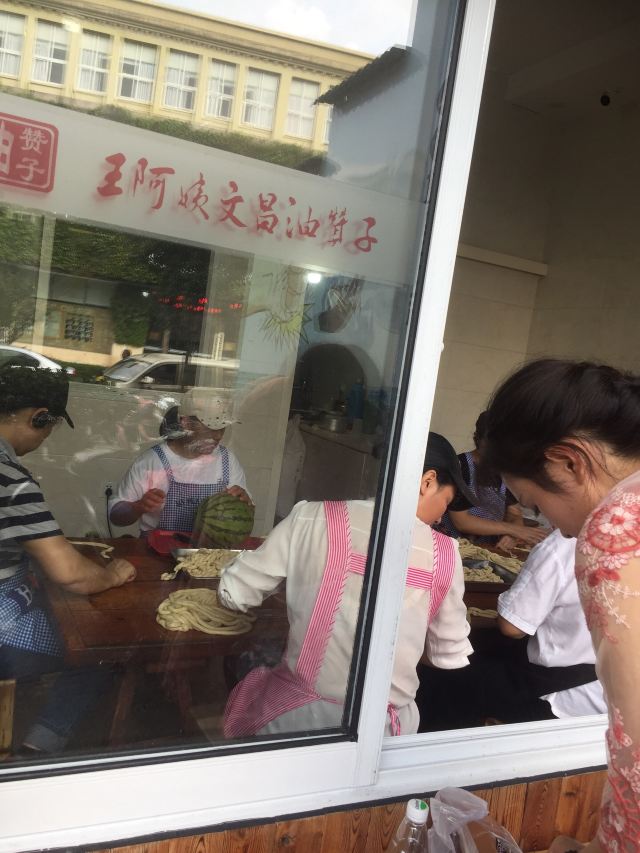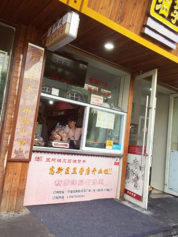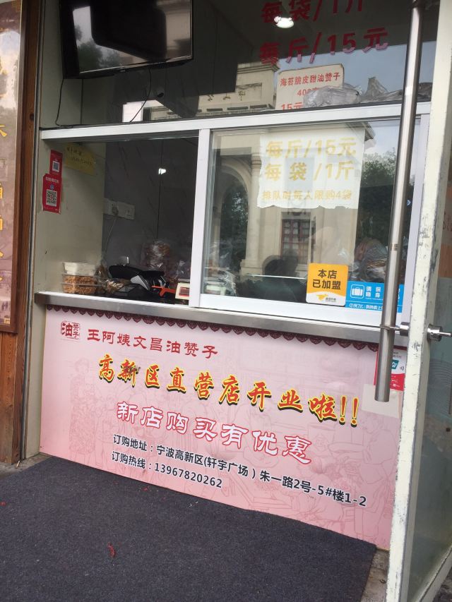 AUNTEL WANG WEN CHANG YOU ZAN ZI王阿姨文昌油赞子 1)店面位置:鼓楼里巷店位于宁波海曙区府桥街上鼓楼小吃街的尽头,中山公园和鼓楼步行街交界的接口处。 2)特色:主营各种口味的油赞子(个头比麻花要小一点),苔条油攒子 、甜油赞子等,手工制作,现做现卖。 3)店面环境: 很大一间房,可以看见手工操作台, 买卖于一体 。 透过明净的玻璃窗,可以看到阿姨们拿出面团慢慢地从中抽出一小团,揉成一根又短又粗的面条,接着按刚才的方法再搓一根,然后将两根相互盘旋起来,放到锅里炸的过程。 新鲜做好的油赞子油大风扇对着吹冷便于装袋售卖,袋子是一般的塑料袋,密封性不好 3)购买体验: 口味有甜有咸,甜的金黄闪亮,像撒上了一层金粉;咸的绿得生辉,有大自然的气息。黄色的传统的略甜,绿色的是海苔略甜略咸 苔条味的油赞子15元一大袋,软硬度刚刚好,满嘴都是亦甜亦咸的海苔香酥脆味道,不油腻。 4)价格:人均15元左右。