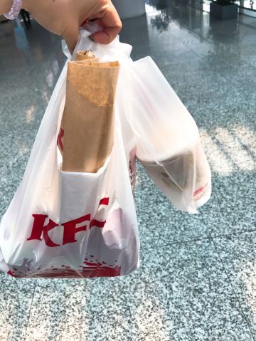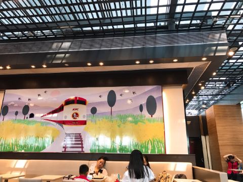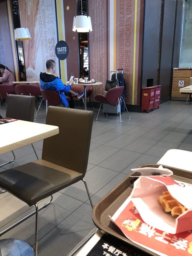 宁波南站KFC在二楼,安检结束后入内坐扶梯上二楼,KFC就在真功夫旁边,一般买了都带走高铁上吃,当然,也可以在店内吃,高铁站方便为主。