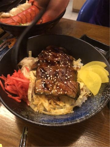 酒蒸鲍鱼,毛蟹,穴子寿司,炸牛肉味增薯饼,鸡肉沙拉,白虾刺身,寿司