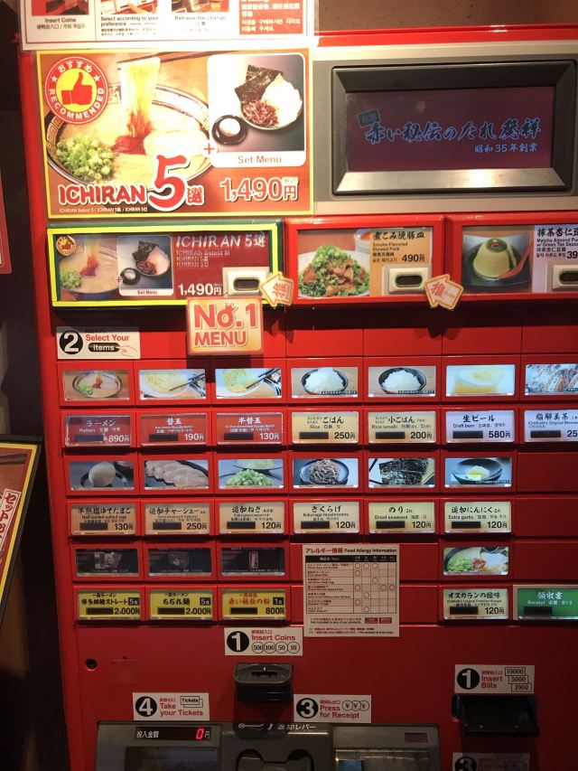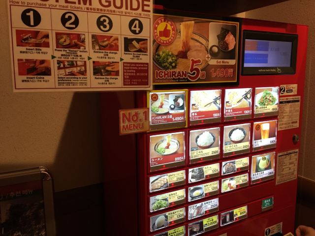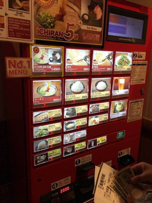 Laotang168一兰拉面名不虚传,汤面很好吃。味道没有传说中非要清淡 非要别太辣,我觉得正好,你以前能否吃辣 能否吃咸,就按照以前的口感选即可。 首先到河边门口排队,不用管给你的单子,吃时才用得上。可能会再领你去另一个门进去,听服务员的即可。 座位在4楼,楼梯很窄,3楼是卖土特产的。到了4楼,先在门口自助点餐机选餐,左上角1490元的实际就是它下面890元额外再加了图中其他的250元猪肉 120元海苔 120元木耳条 130元鸡蛋,选1490贵了600元 比单点这4样省了20日元,其实是不划算的。 自助点餐步骤:1.放硬币或者纸币 2.放多少 够买什么 什么菜品就会亮灯,不够买的就不会亮灯。途中可以不断加放钱币,不断选。选哪个菜品 就点一下,左下角就会出来卡片。多余的钱会自动退出来。 然后领你去1 2 3号的格挡,每人一个小卡台,把菜品卡片放在卡台前面,还要把一开始排队时给你的纸选一下口味 调料等,有服务员收走卡片和纸 给你上菜品。途中你可以加菜 加调料等,除了醋收费外,其他调料适量免费。加菜的收费都只收现金,卡台前有按铃。卡台服务员有中国人,很方便。
