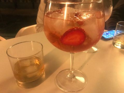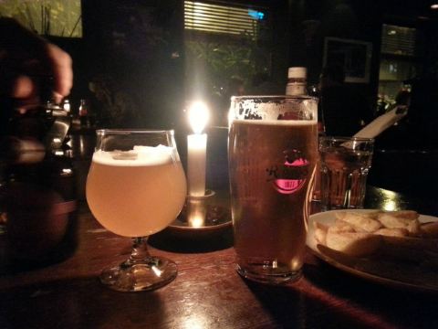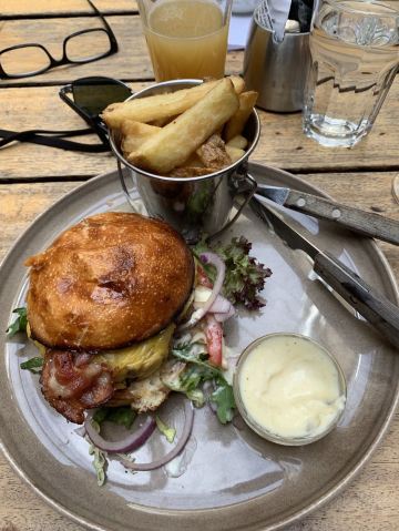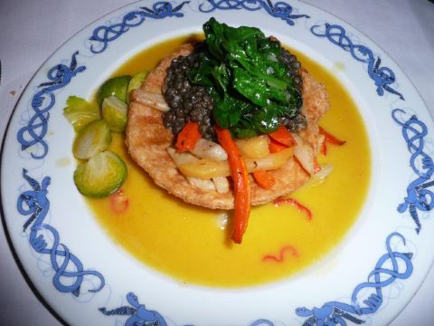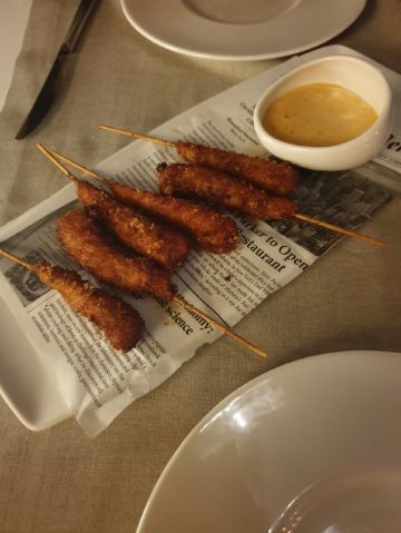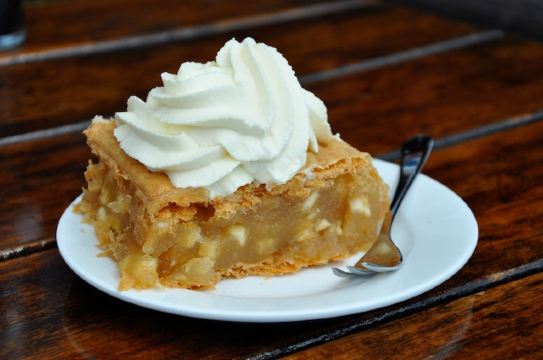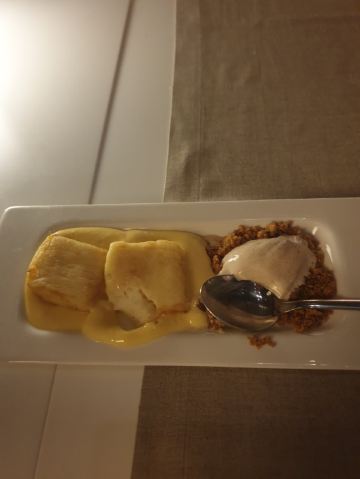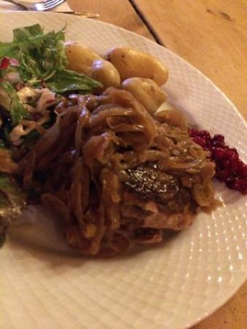 为了一个苹果派居然要翻山越岭 Frognerseteren,来这家餐厅,最主要的是吃,奥斯陆号称最好吃的苹果派。果然,这个pie比较特别,下面一层pie的主要部分,是一层苹果泥夹带着苹果粒,做的有点软,但是有点像软糖的感觉,上面有一层脆饼,再加一层奶油,甜而不腻,很清新。 定了7点半的位子,到的有点早,所以决定在周围拍拍照片。餐厅里面正在举行一个复古party,里面奇装异服的人好多。 点了一份挪威LAKS,也就是三文鱼。烤鱼好大一块,单吃这一份就已经很薄了。三文鱼不是很肥,感觉挺瘦的。口感也很好,十分推荐。