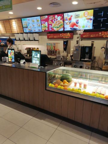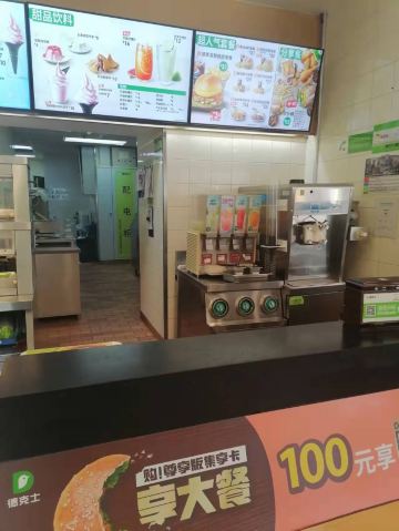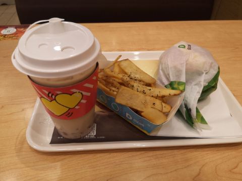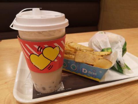 这边的奶茶就普普通通,不过比较的解渴,用套餐的话,就享受不到店铺里面加一块吃汉堡的优惠了,还有薯角也一般,不过服务还算是不错,至少空调是挺舒服的,外面就是公交站。