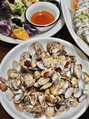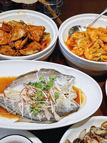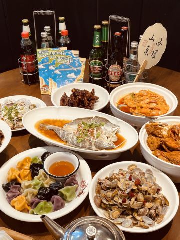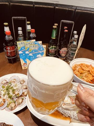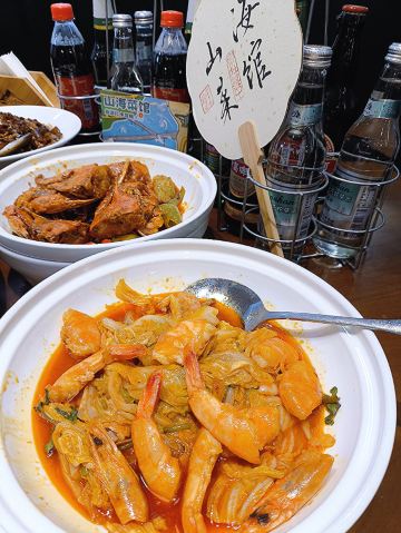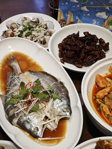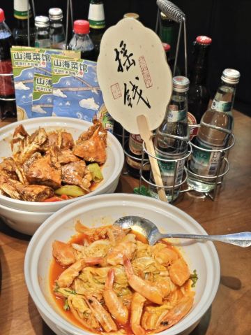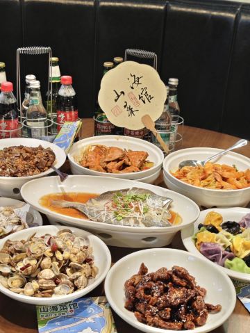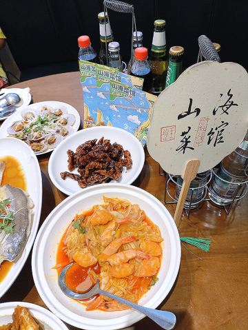 鲅鱼饺子,葱烧海参,大虾烧白菜,辣炒蛤蜊,辣蛤蜊,大红肠,青岛海凉粉,青岛大虾,山海香酥鸡,椒麻小海鲜一锅蒸,黑松露甲鱼裙边拌饭,秘制香辣蟹,玫瑰盐黑椒牛仔粒,老青岛炸肉,老坛酸菜鱼,白菜爱上虾,香酥鸡,米饭,海凉粉