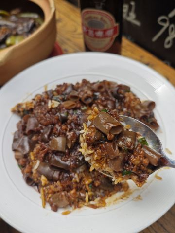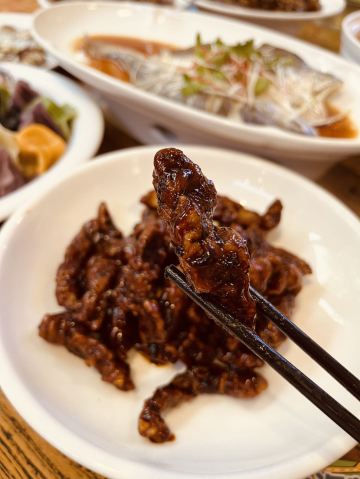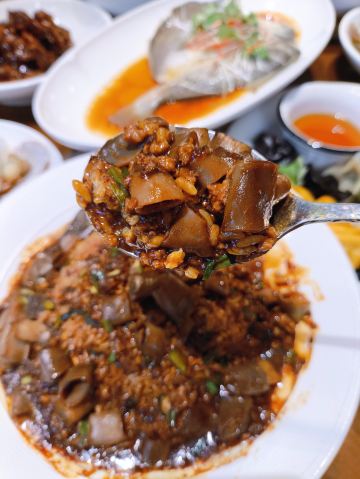 这家位于湖南路34号老舍公园旁边,离栈桥和天主教堂都200左右的山海菜馆•海肠捞饭•青岛菜就是你的不二之选! 他家主打现捞现吃的活海鲜, 妥妥的新鲜美味! 吃饱喝足直接去玩耍,还是逛累了来打尖吃个饭都非常惬意,简直不要太美啊。 店里招牌菜海肠捞饭,一块块的海肠竟然辣么大,爆炒过的海肠包裹着米饭,ju好吃,品质新鲜,口感脆嫩,鲜掉眉毛有木有,我自己都能旋掉一份。 炒香辣蟹,都是活的,肉质饱满,鲜甜入味,就连蟹钳都有很多肉,香香辣辣 好吃到舔手指头。 油淋大黄鱼,黄花鱼本身肉质鲜嫩,经过恰当的烹饪,油淋后的黄花鱼色泽金黄,油亮有光泽,搭配上葱丝、姜丝和红椒丝的点缀,视觉效果极佳,让人食欲大增。 鱼肉超级嫩,筷子轻轻一夹就散开了。 黄花鱼的鲜嫩被完美地保留了下来,每一口都是享受。 鲅鱼饺子,馅料是真正的主角,鲅鱼肉细腻鲜嫩,毫无腥味,与适量的葱姜等调料完美融合,味道鲜美至极。 这里的糖醋里脊竟然是小时候那种味道,完全是醋和糖调的汁,外酥里嫩,酸甜口味。 征服你的不仅仅是青岛的美景,还有山海的美味佳肴,来这里就餐,你必不后悔!