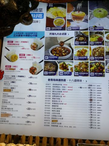 虾水饺,宫爆超级大虾球,锅烧碟鱼头,宫爆虾球,开海小蛤喇,海肠水饺,笔管鱼小白菜,牛油果蔬沙拉,开海招牌虾水饺,开海全家福水饺,开海秘制碟鱼头,外婆捶山茄,辣炒小鲍鱼,辣炒红岛花蛤,黑蒜烤生蚝,海胆,青岛老炸肉,海肠捞饭,葱烧海参,鲍鱼