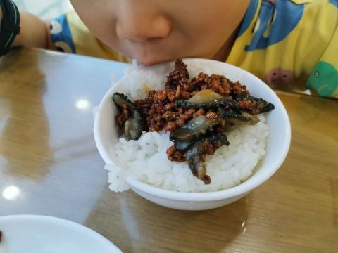 触手梨花来青岛的第一餐,选择了离入住酒店很近的万鑫餐厅。没什么装潢可言,窗明几净,朴实无华,地板亮得能照出人影,冷气足得能让人起鸡皮疙瘩。服务也很有老餐馆的范儿,简练、到位但不多说废话,不会像某些店刻意嘘寒问暖。 人少不好点菜,便叫了两道招牌菜——肉沫海参、大虾白菜。肉沫海参最吸引人的不是海参,而是肉沫。肉质很好,基本没有肥筋,酱香十分浓郁,再加上爽口弹牙略带嚼劲的鲜海参,非常下饭,两个孩子每人都吃了满满一碗饭。大虾白菜也不遑多让,虾头里的虾油被充分逼出,白菜取的较嫩的部位,烧得也透,足足地浸润了虾油,鲜得简单粗暴,舌头上的味蕾仿佛缴械投降,准备迎接鲜味的冲击。大虾个头不小,非常新鲜,肉质紧实有弹性,虾头里都有不少肉。清香的白菜裹上浓香的虾汤,又是一道下饭利器。 两道菜,再加冒尖的两碗饭,三人吃得饱饱,开心地下海去了。