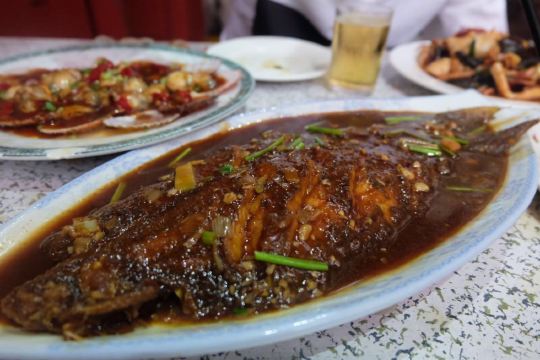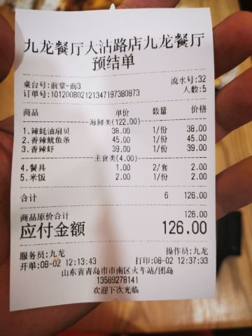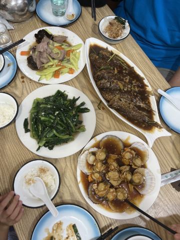 JiuLong Restaurant (DaGu Road No.2)两个人点了5个菜,吃的很撑,没吃完。海鲜都很新鲜,个人推荐扇贝和大虾,舌头鱼一般,吃多了有点腻,蛤蜊也一般。菜分量都挺足的,老板也挺热情的,我们去的时候也没有等位,到了就直接坐下吃了,上菜很快