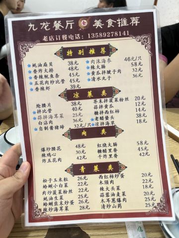 吾是土豆泥10年前来的九龙餐厅,这次带着父母孩子故地重游,下了飞机租了车子🚗第一站九龙餐厅。 还是记忆里的九龙餐厅🍴,犹如上海进贤路上的茂隆餐厅,小小的馆子,开了好多好多年。菜都不贵,性价比超级高,价格实惠,这也是那么多人排队的原因,除了空调不是很给力。 基本点的都是招牌菜,很多菜都烧的浓油赤酱,和上海本帮菜口味差不多。 五花肉炒比管 比管鱼Q弹有味, 蚝油扇贝 扇贝咸鲜十足。 炸虾仁 十年前就这道菜让我对他们家印象深刻,当时也是为了吃九龙餐厅特地来了2次。 红烧黄花鱼 黄花鱼就是江浙的小黄鱼,他们家红烧的颜色偏深。 蛤蜊冬瓜汤 很不错的汤,味道鲜美,做法简单,回去可以尝试自己做做。 炝腰片 黄瓜爽脆,腰花还是有点腥味。 来这里吃饭的基本三三两两,吃完了看到门口还在络绎不绝的排队。大沽路上停车🅿️很紧张,我是车位没有只能绕到停车,没想到停到了河南路上的连锁店附近。 看着九龙餐厅附近的拆迁通告,大沽路这里应该也快动迁了,美好的记忆。