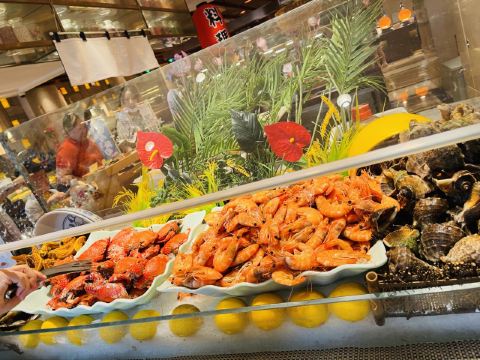 带子,芝士焗扇贝,牛仔骨,铁板羊排,椒盐虾,铁板秋刀鱼,雪蟹,酸奶,三文鱼,自助餐,冰淇淋,生鱼片,烤榴莲,日式烤鳗鱼,鳗鱼饭