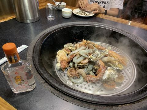 这家餐厅的招牌大锅蒸海鲜吃法很特别,上层蒸海鲜,下层可以选择一种汤,蒸好海鲜之后先吃海鲜,然后再细细品尝下层渗入海鲜原汁的汤,然后还可在锅周围糊上玉米面饼子。简直不要太好吃!