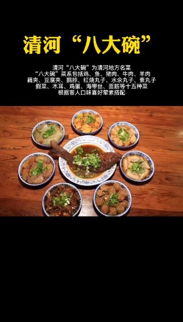 清河八大碗是清河地区传承悠久的婚宴核心菜肴,起源于招待新娘送亲方的最高待客规格 2 。其菜品突破传统八碗限制,包含鸡、鱼、猪肉等15种荤素食材自由搭配 1 ,独创"先炸后蒸再浇高汤"工艺3 ,以焦香五花肉片与菱纹炸豆腐组合蒸制的扣肉最具特色1 。该宴席从婚宴专属逐步演变为大众餐饮,截至2024