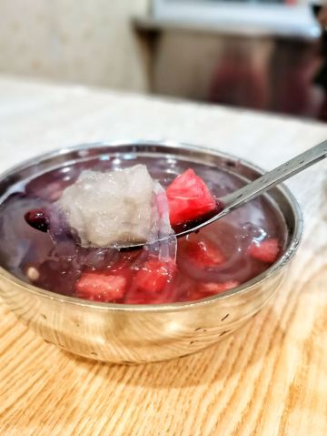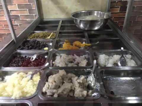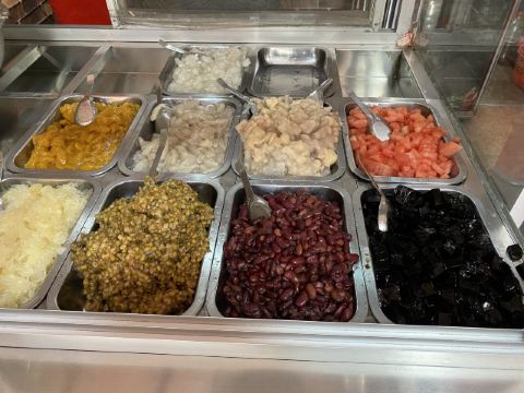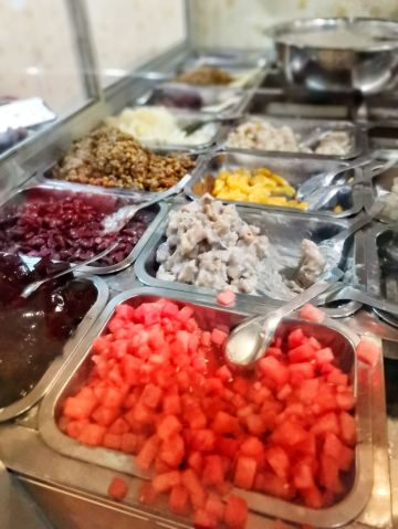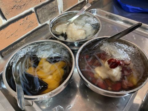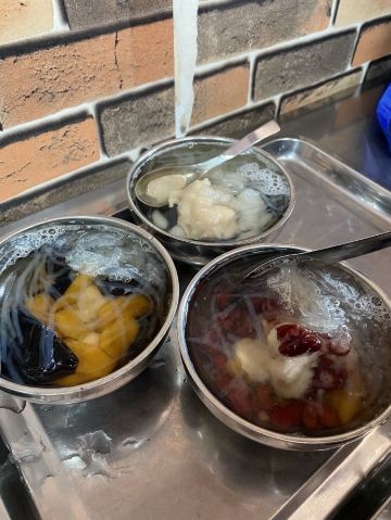 这家店小小的,藏在人民政府旁边。仅有几张桌子,客人的流动却特别快。因为是街头小吃,大家渴了热了进来吃一杯就走,也不会特地坐很久。 🌟亮点特色: 柜台里的配料眼花缭乱, 薏米,绿豆,红豆,莲子,白木耳,各种水果,如菠萝、芒果、西瓜等,有的还有蜜饯,仙草,芋圆,布丁,圆子,我的天哪,瞬间选择障碍。