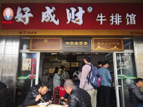 在鲤城区涂门街的通淮关岳庙对面一侧,有一家叫好成财牛排馆的百年老字号,以牛排等牛肉小吃著称,一到饭点时分,经常门口排起长龙,店内一座难求。