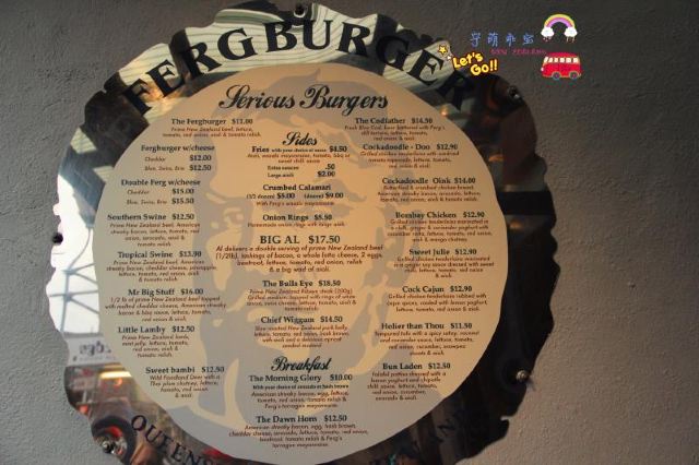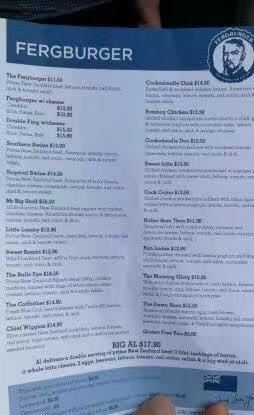 牛肉汉堡,鳕鱼堡,炸鱿鱼,Fergburger,双层牛肉,Ginger Beer,Southern,Bull' eye burger,Lamby,芝士焗意面,奶昔