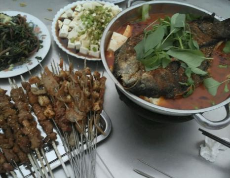 麻辣小龙虾,地锅饼,香煎翘腰,葱爆羊肉,麻辣鸭头,烤鱼,麻辣蟹钳,蒸菜,爆炒小公鸡,鸡汁千张,红烧鱼块,酸辣白菜,羊肉串