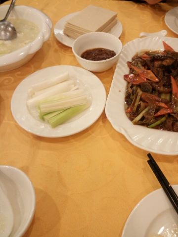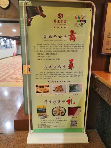 winjone紧贴孔庙的位置,据介绍是比较地道的孔府菜,餐厅位于星级饭店里,大堂宽敞干净,中规中矩。菜品很有特色,记得是住在旅馆里,所以几乎是每顿饭都在这里吃。很多菜的名字都很有特色,据说来自于孔府家宴菜谱,记得阳关三叠,鲁壁藏书和书香银杏是招牌菜,印象很深刻,听着就有文化,创意十足,充分体现了孔子食不厌精的饮食态度。阳关三叠是蛋皮、鸡肉和菠菜三层卷,口味清淡,非常精致;鲁壁藏书实际是薄如纸的面饼卷上当地特色的修肉,这种修肉在孔子见阳虎中有记载;书香银杏是糖稀浸的银杏果,非常漂亮,但不知是否是孔子手植的那颗银杏的果实,量很足,人少还是别点为好,银杏食用多了有毒性,最好不超过5粒,浪费可惜。临走我们还单点了一包山东香肠带走,坐在高铁上还能隐约闻到香料的味道。