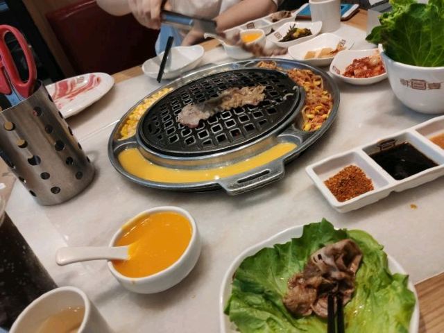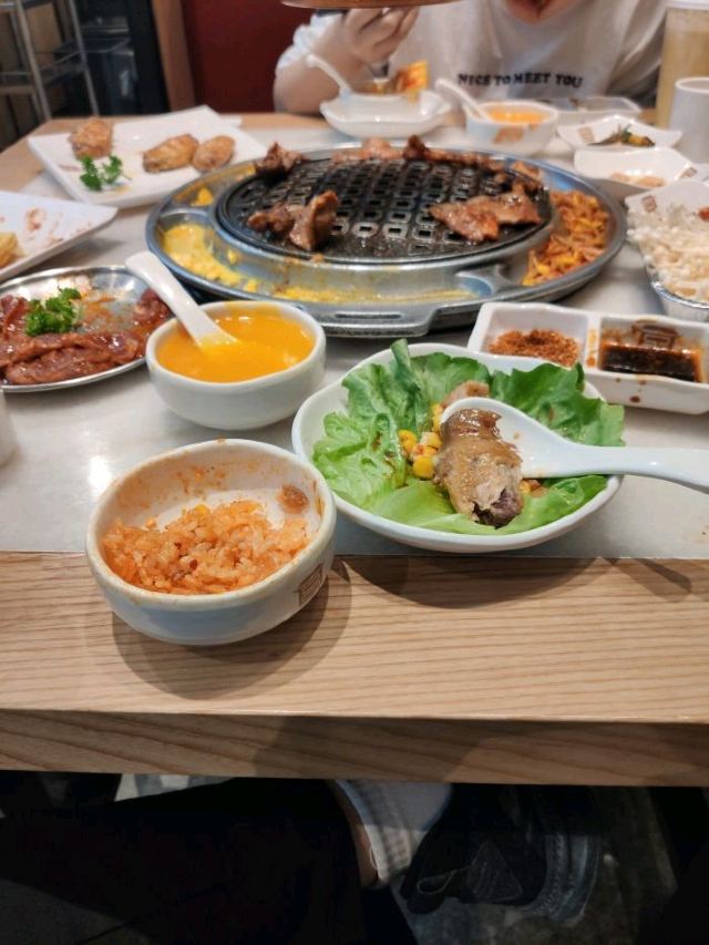 推荐,特酱五花肉,口感很好。 泡菜石锅饭味道也相当好,吃了还想吃第碗 鸡胗,相对有点大,要是再对半切一下,应该会口感更好。 最后金针菇,我开始直接把金针菇夹出来放到烤盘上,结果烤焦了,往金针菇盒里一看原来是连盒子直接放烤盘,不过味道还是不错的