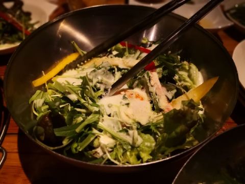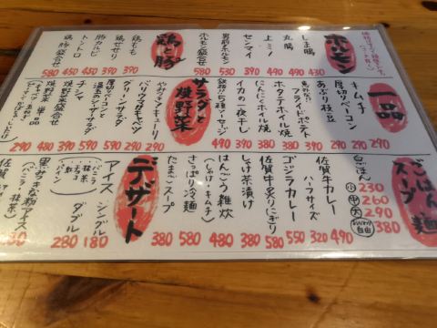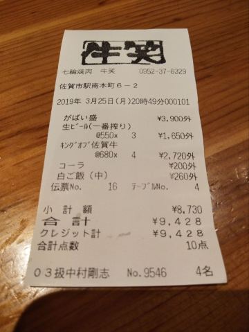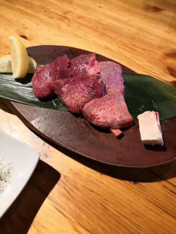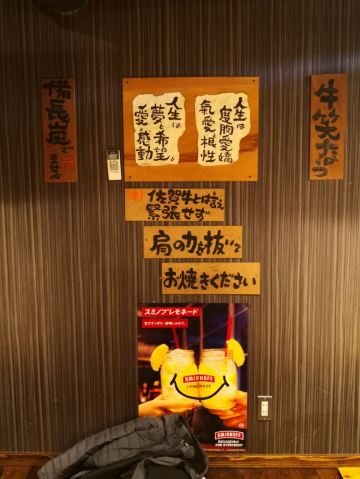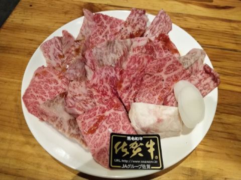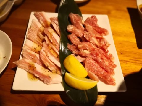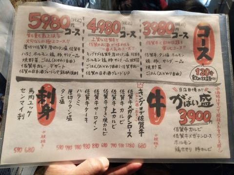 食神牛佐贺日本料理好评榜排名第四的饭店,从鸟栖回来已经晚上7点多了还需要排队等位。店铺中等规模,店堂比较狭窄,一边是四人餐桌,一边是和式小格间。传统的日系装修装饰,菜品以各种佐贺牛肉烧烤为主题,有马肉刺身,猪肉、鸡肉烧烤,前菜、一品料理、蔬菜类、主食甜品等,还有三种档次放题。 点了招牌的拼盘3900円,包含几个部位的佐贺和牛、猪五花、鸡肉、牛肥肠。和牛排脂肪非常丰厚烤后有淡淡的奶香味,吃口很酥嫩柔滑部分筋韧,猪五花剪开烤的焦焦非常香酥,鸡肉细嫩牛肠肥润。 最好吃的肉反而是680円一份的特选和牛,口感非常的细腻鲜嫩。 朝日一番榨550円,可乐200円。 性价比蛮不错的日式烧肉店,环境有些老旧顾客多的时候烤肉的油烟味有点重,服务非常亲切细致不过因为忙没时间帮你烤肉。