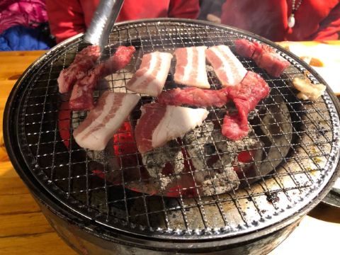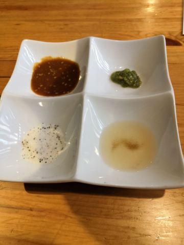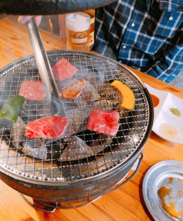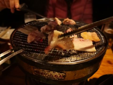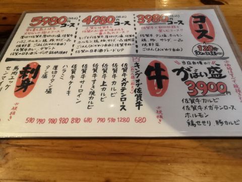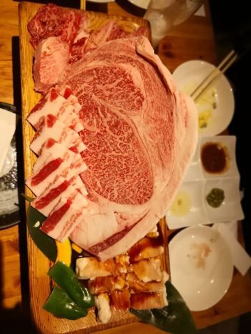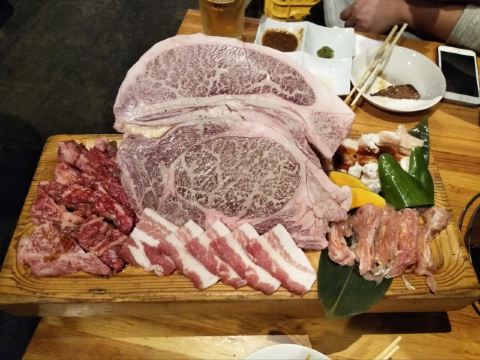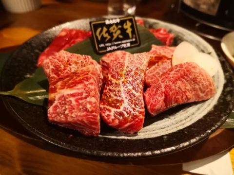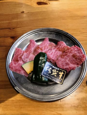 佐贺日本料理好评榜排名第四的饭店,从鸟栖回来已经晚上7点多了还需要排队等位。店铺中等规模,店堂比较狭窄,一边是四人餐桌,一边是和式小格间。传统的日系装修装饰,菜品以各种佐贺牛肉烧烤为主题,有马肉刺身,猪肉、鸡肉烧烤,前菜、一品料理、蔬菜类、主食甜品等,还有三种档次放题。 点了招牌的拼盘3900円,包含几个部位的佐贺和牛、猪五花、鸡肉、牛肥肠。和牛排脂肪非常丰厚烤后有淡淡的奶香味,吃口很酥嫩柔滑部分筋韧,猪五花剪开烤的焦焦非常香酥,鸡肉细嫩牛肠肥润。 最好吃的肉反而是680円一份的特选和牛,口感非常的细腻鲜嫩。 朝日一番榨550円,可乐200円。 性价比蛮不错的日式烧肉店,环境有些老旧顾客多的时候烤肉的油烟味有点重,服务非常亲切细致不过因为忙没时间帮你烤肉。