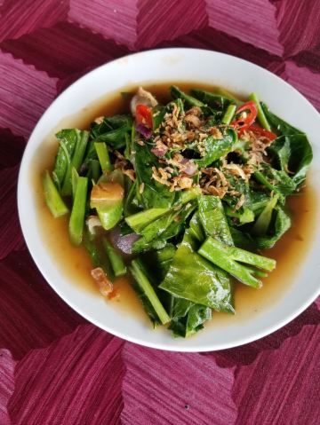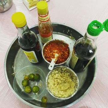 椰子饭,油炸沙丁鱼,素炒四角豆,红烧鱼皮,鲜鱼汤,酸鱼汤,回民鱼汤,炒牛肉,干煸老鸭,炒鱿鱼,地瓜叶,四角豆