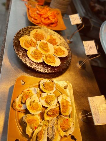 NO.1 Seafood Restaurant (Yalong Bay Mangrove Tree Resort)第一线海鲜餐厅,在三亚亚龙湾的红树林酒店内,紧邻海岸线。餐厅是开放式的,景色宜人。离海岸线很近,半晚的时候特别漂亮。 五星级酒店标准化服务,服务人员素质都很高,训练有素。很热情。 需要的时候,身边一定会出现服务人员,自嗨的时段,跟在自家区域用餐一样自由惬意,很有分寸。由于我们是参加酒会晚宴的客人,整个海岸线都是我们的。服务员将帮忙加工炒好的生蚝、扇贝、大虾等海鲜源源不断的派送到我们的餐桌,特别贴心。 烤秋葵第一次吃,火候正好,丝丝甜意滑润可口。以前不喜欢吃秋葵这次都爱上了它。 韭菜的味道绝佳,这里的韭菜口感细腻,无柴多汁,不加任何调料已是佳肴一道。 人到中年(不是,晚餐不敢太放肆,于是放过了很多油腻美味。酥脆的羊排、入口即化的牛排都只敢尝一点点。 羡慕年轻人啊,好呆姐也曾经年轻过,夜夜笙歌无肉不欢过哇咔咔。 沙拉区我必须经常溜达,一盘盘吃草也真是情非得已。新鲜的蔬菜、豆类、品类丰富,热情的档口小伙儿推荐品尝了他们的泰式沙拉拌。 呃,吃不惯,酸酸的口感夺取了食材自身的味道,只能尝尝… 总体还是不错的一次用餐体验,可以打95分,少给五分怕他们骄傲。哈哈哈。人均249。