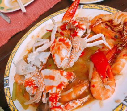 和乐蟹,姜葱炒虾,烤生蚝,烤大虾,烤秋葵,烤羊肉串,烤鱼,亚龙湾海风烤韭菜,海风就韭菜,海南鸡饭,涮毛肚,炒蟹