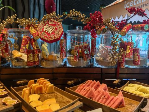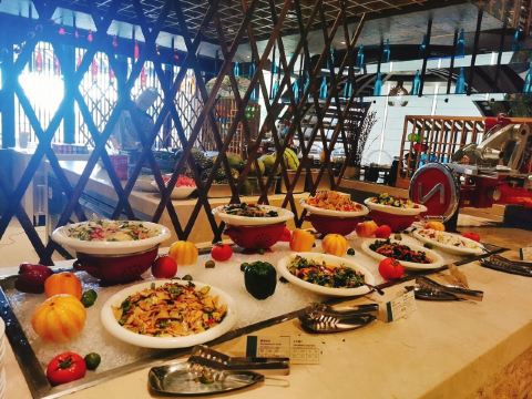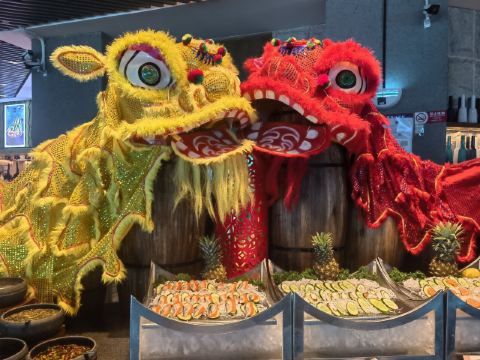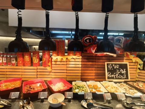 现煎鹅肝配蓝莓酱,卡露伽7年鱼子酱,波斯顿龙虾杯配番茄冷汤,三文鱼,美人鱼表演,甜点,刺身,现煎羊排,小龙虾,烤肉档,现做意大利面,冰镇熟海鲜,蒜蓉扇贝,香草烤羊排