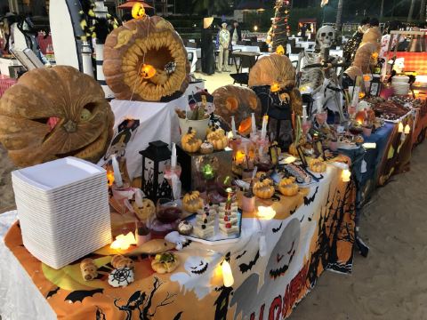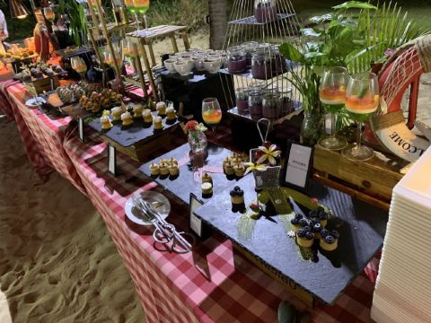 烤乳猪,龙虾,三文鱼刺身,奶油澳带慕斯拼泰式芒果塔,现烤吐司,新鲜椰子水,海鲜,黑蒜烤生蚝,池畔烧烤自助晚餐,烤羊排,冰淇淋,面包,牛肉,生菜沙拉,沙滩海鲜烧烤自助晚餐