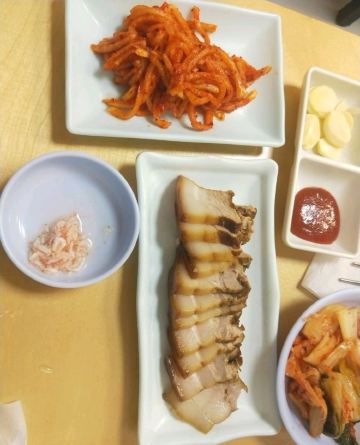 做的韩国冷面的味道不错哦,里面的冷面很q,面条有的类似于米线一样的东西,里面的白肉做的不错哦,肉很香,一吃就饱了,配上大蒜很棒。