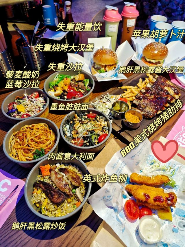 失重烧烤大汉堡,失重烧烤牛背排皇,德式烤肠拼盘,风味甜鸡翅,肉酱意大利面,牛油果草莓果蔬沙拉,伊比利亚烤黑猪肋排,猪肋排,炸鸡块配薯条,炸鱼柳,失重香脆烤半鸡