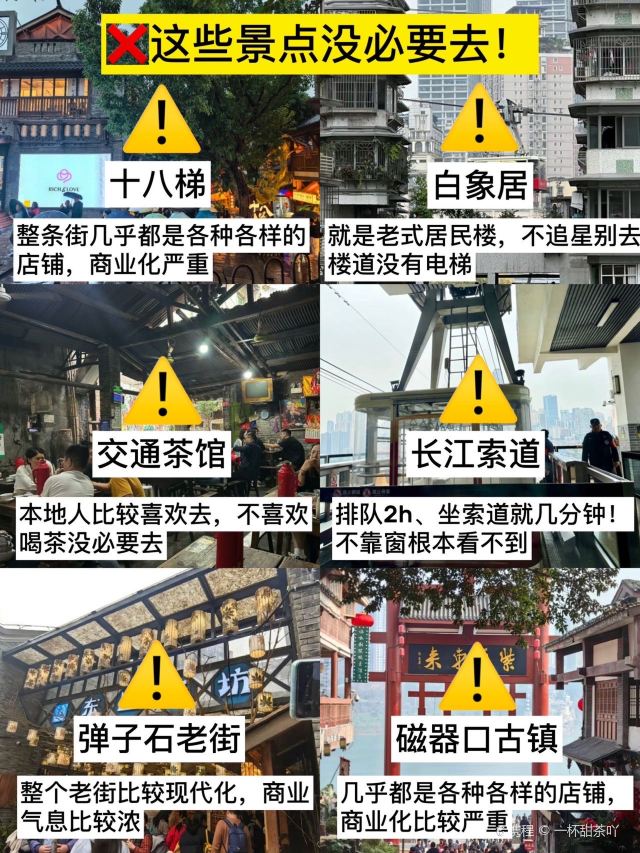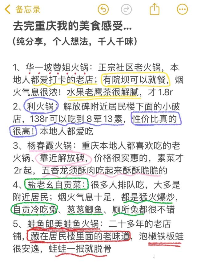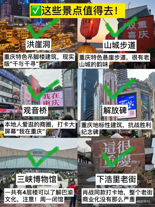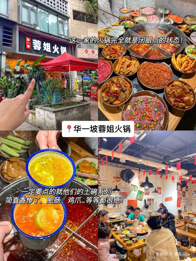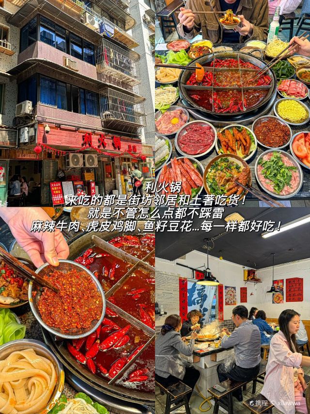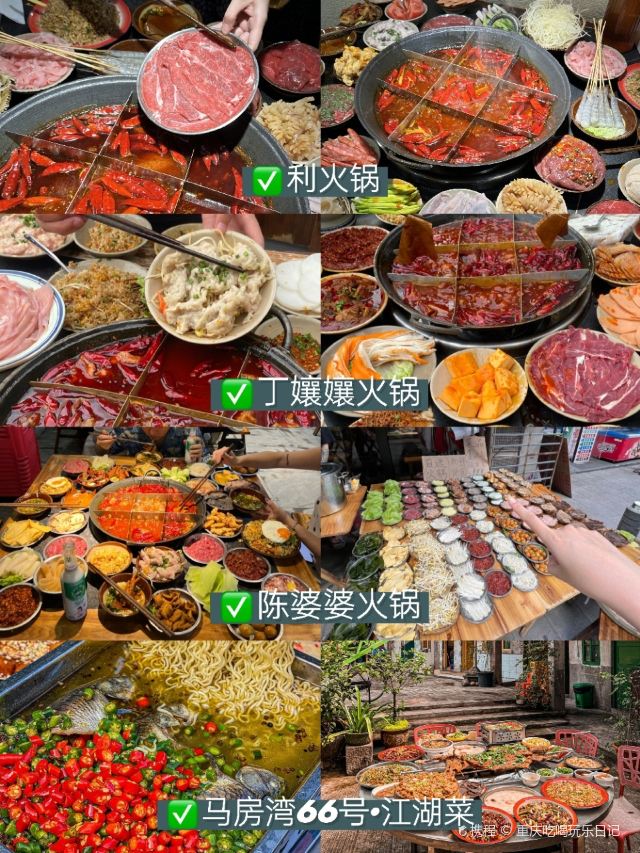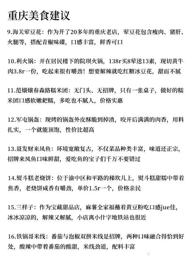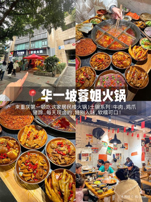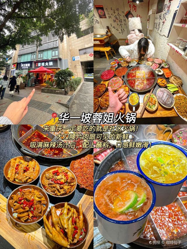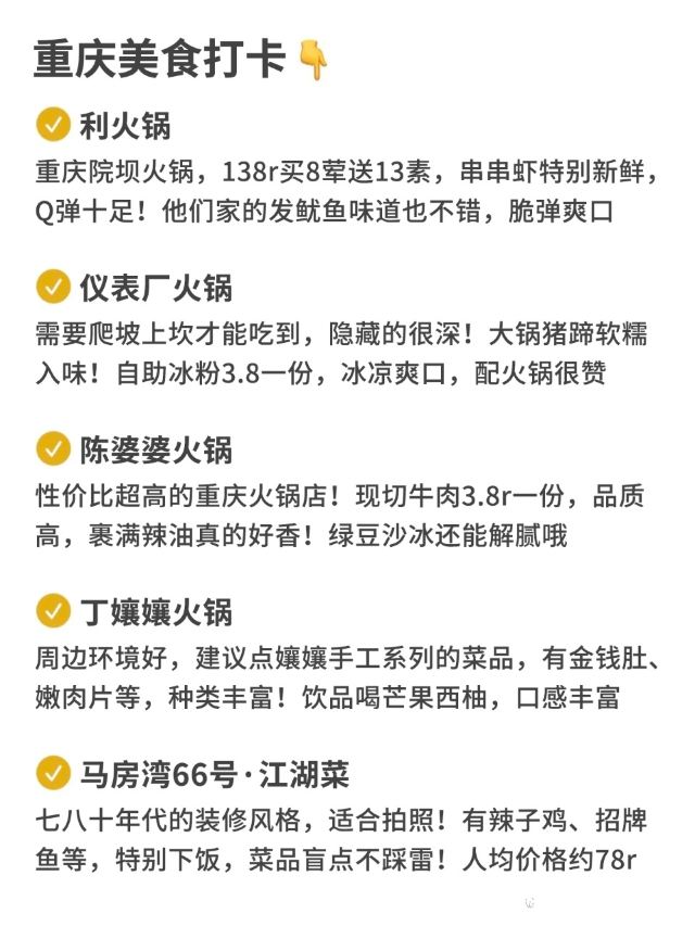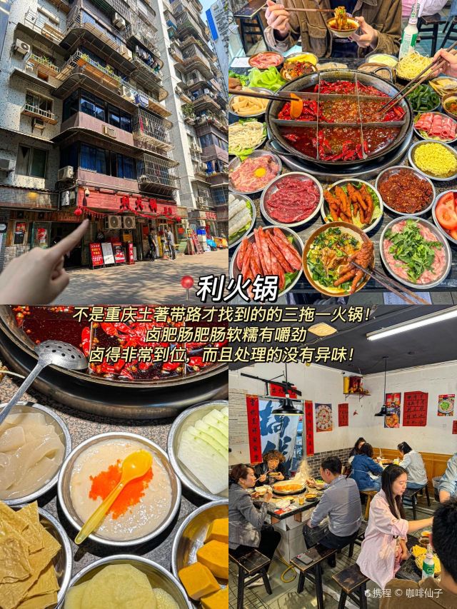 一杯甜茶吖刷了很多很多重庆攻略,发现大家对重庆的感受都不一样!我来分享一下自己对重庆的感受!(纯个人意见,客观评价) - 1、华一坡蓉姐火锅:正宗社区老火锅,本地人都爱打卡的老店;有院坝可以就餐,烟火气息很浓!水果老鹰茶很解腻,才1.8r 2、利火锅:解放碑附近居民楼下面的小破店,138r可以吃到8荤13素,性价比真的很高!本地人都爱吃 3、杨春霞火锅:重庆本地人都喜欢吃的老火锅、靠近解放碑,价格很实惠的,素菜才2r起,五香龙须酥肉吃起来酥酥脆脆的 4、盐老幺自贡菜:很多人排队吃,大多是附近居民;烟火气息十足,都是猛火爆炒,自贡冷吃兔、葱葱鲫鱼、厕所兔都很不错 5、蛙鱼郎美蛙鱼火锅:二十多年的老店铺,藏在居民楼里面的老味道,泡椒铁板蛙很安逸,蛙蛙一抿就脱骨 - #山城#重庆旅行攻略#重庆旅游#重庆#重庆游玩攻略