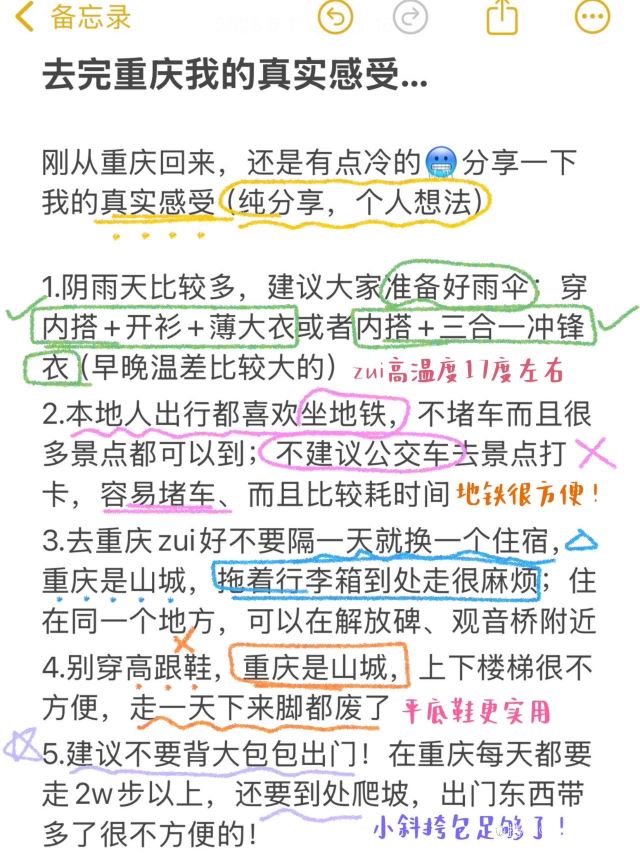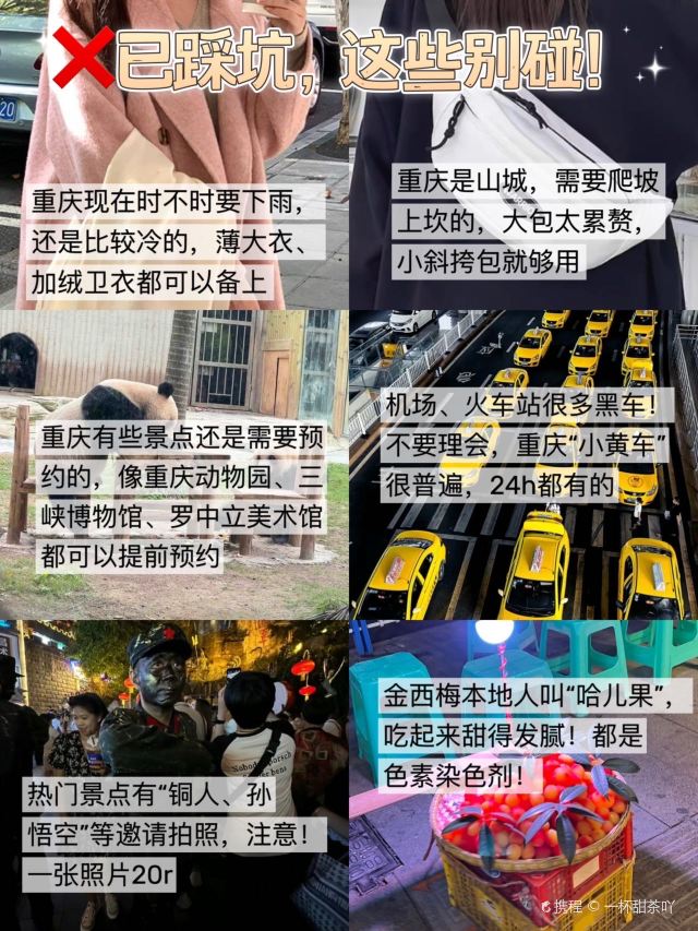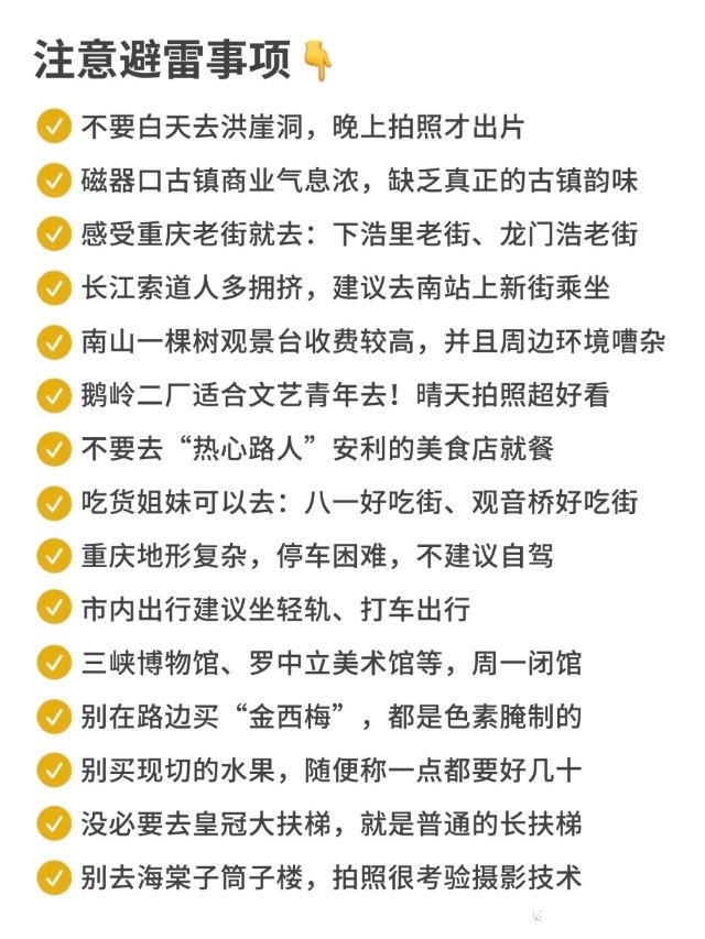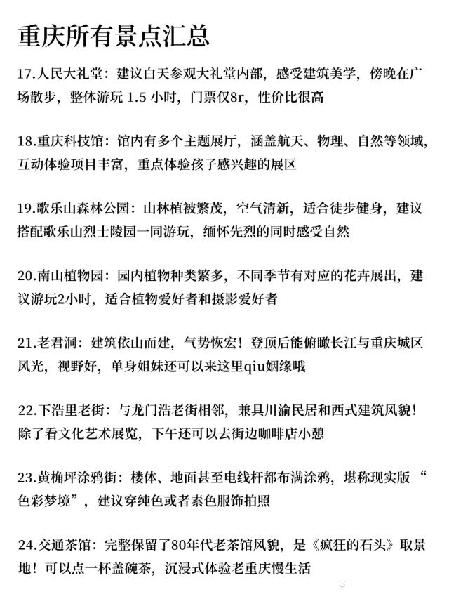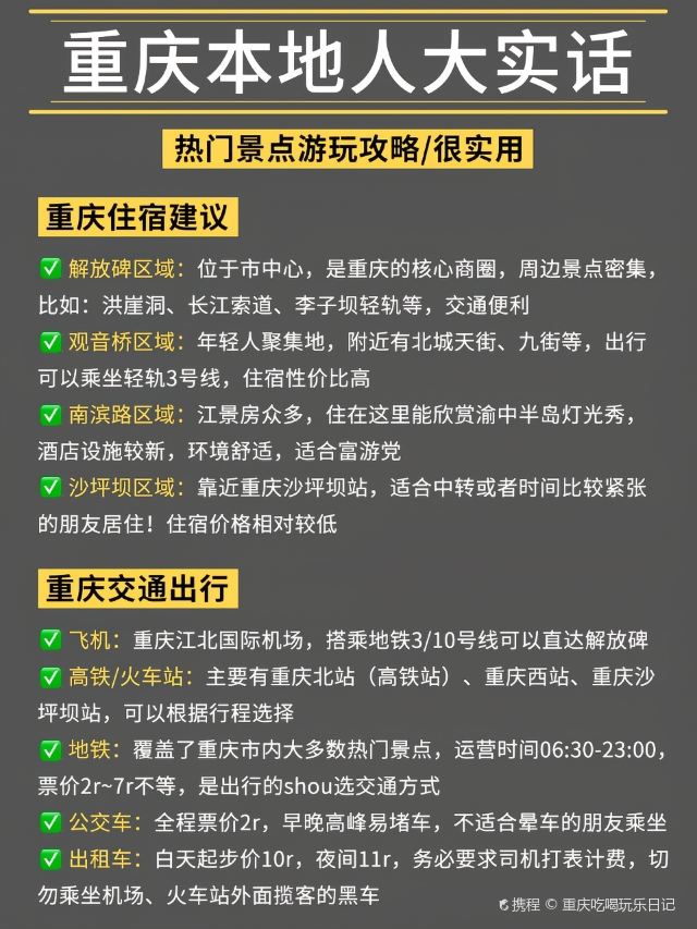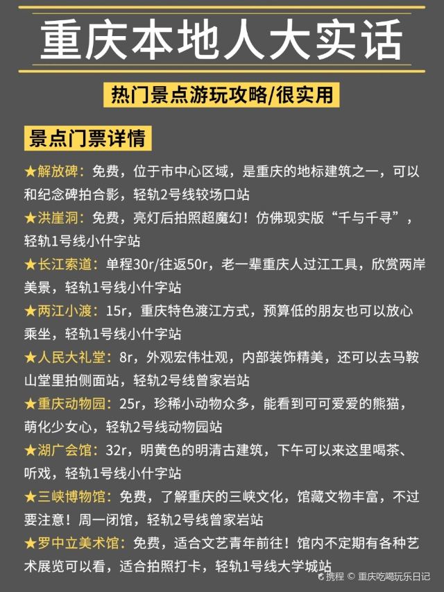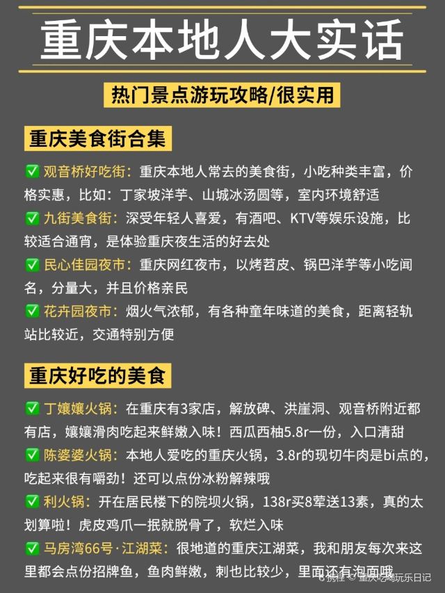 重庆吃喝玩乐日记作为土生土长的重庆人,今天把自己压箱底的重庆旅游干货全掏出来了!近期计划来重庆的宝子,可以直接把这篇攻略收藏⭐起来,吃喝玩乐一篇搞定❤️ _ ⛅近期天气情况 10月份的重庆早晚温差大,出行建议穿外套🧥(方便穿脱)!注意!重庆近期的雨水💦比较多,出门要留意好天气预报🌧️,看看有没有冷空气突袭🙀 _ 🤟重庆轻轨沿线景点分布 1️⃣号线 洪崖洞、山城步道👣、鹅岭公园、鹅岭二厂、重庆来福士、重庆湖广会馆、罗中立美术馆🖌️、熙街、磁器口古镇 2️⃣号线 解放碑、李子坝轻轨🚈、李子坝、三峡博物馆、重庆市人民大礼堂、重庆动物园🐼 3️⃣号线 观音桥步行街、观音桥好吃街、北仓文创园、塔坪社区、不夜九街、南滨路 6️⃣号线 龙门浩老街、下浩里老街 _ ❓重庆有哪些好吃的😋 💢丁孃孃火锅 锅底牛油味醇厚!孃孃滑肉吃起来鲜嫩入味!饮品🥤就喝西瓜西柚,5.8💰一份,入口清甜 💢陈婆婆火锅 本地人爱吃的重庆火锅,3.8💰的现切牛肉是招牌,吃起来很有嚼劲 💢利火锅 138💰买8荤送13素,真的太划算啦!🐔虎皮鸡爪一抿就脱骨了,软烂入味 💢马房湾66号·江湖菜 很地道的重庆江湖菜,招牌鱼🐟真的很好吃,鱼肉鲜嫩,刺也比较少,里面还有泡面哦 _ #重庆火锅#重庆攻略#社区火锅#居民楼火锅
