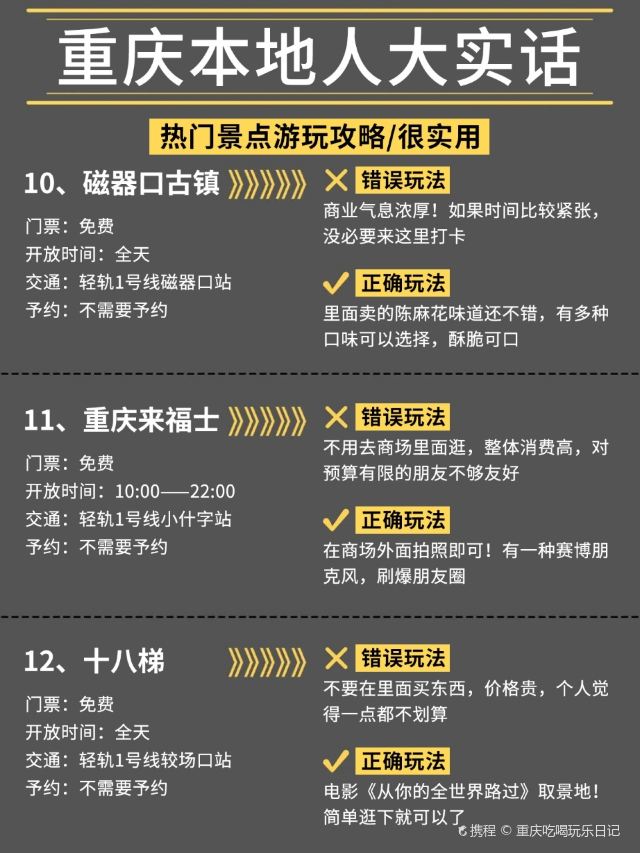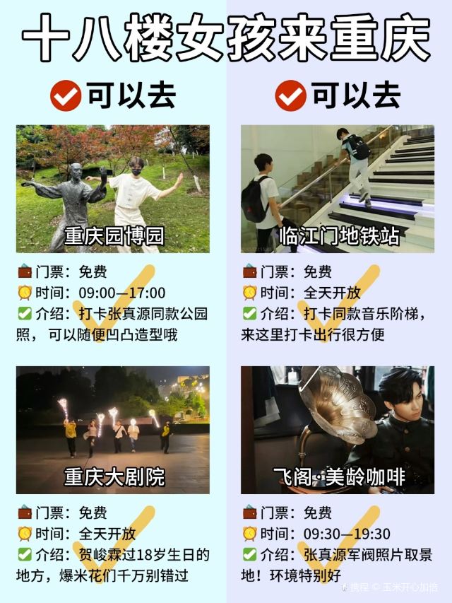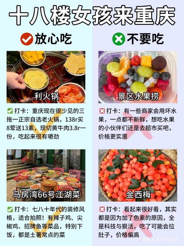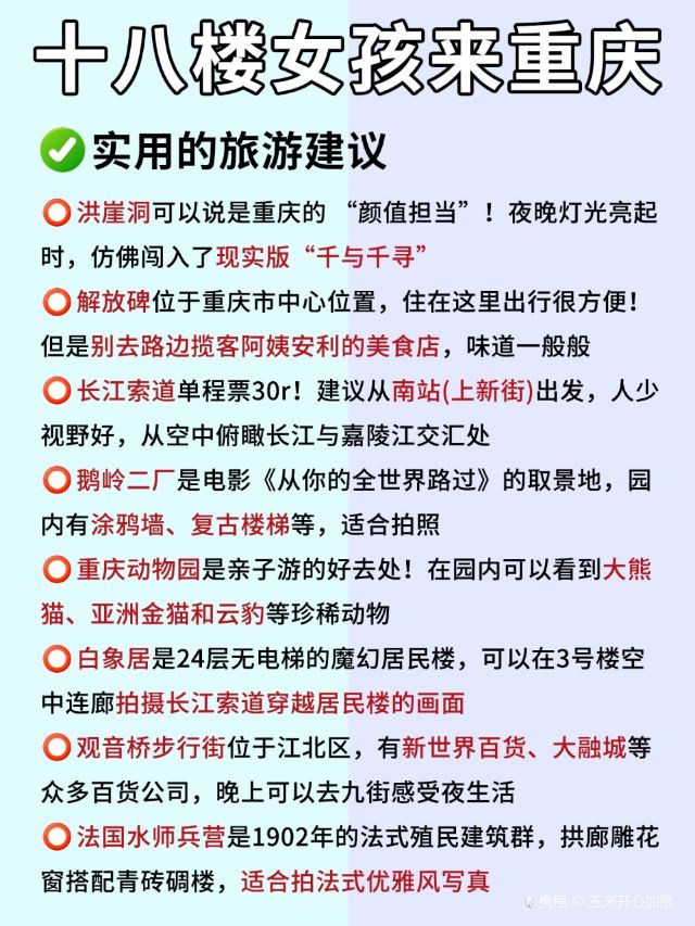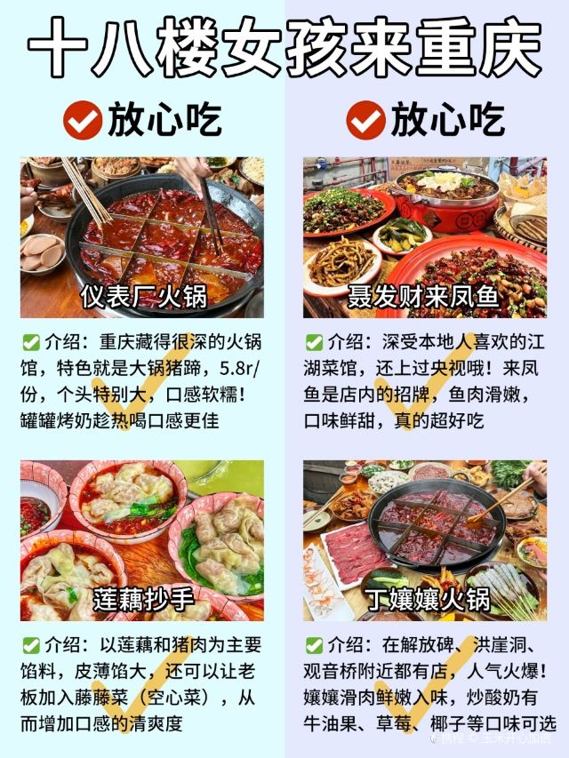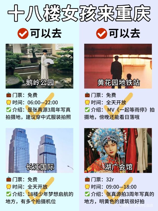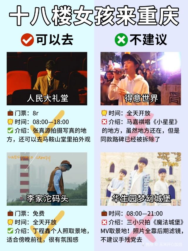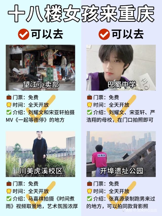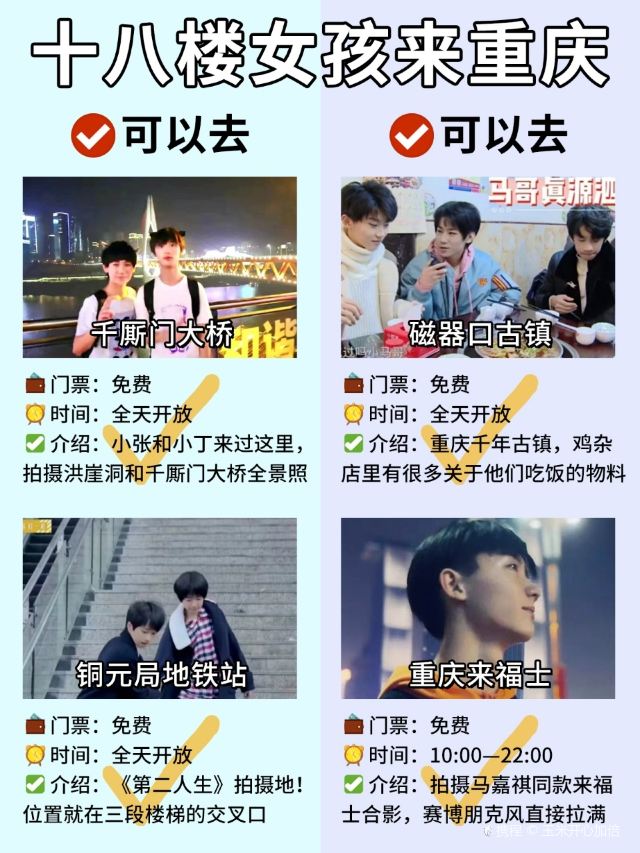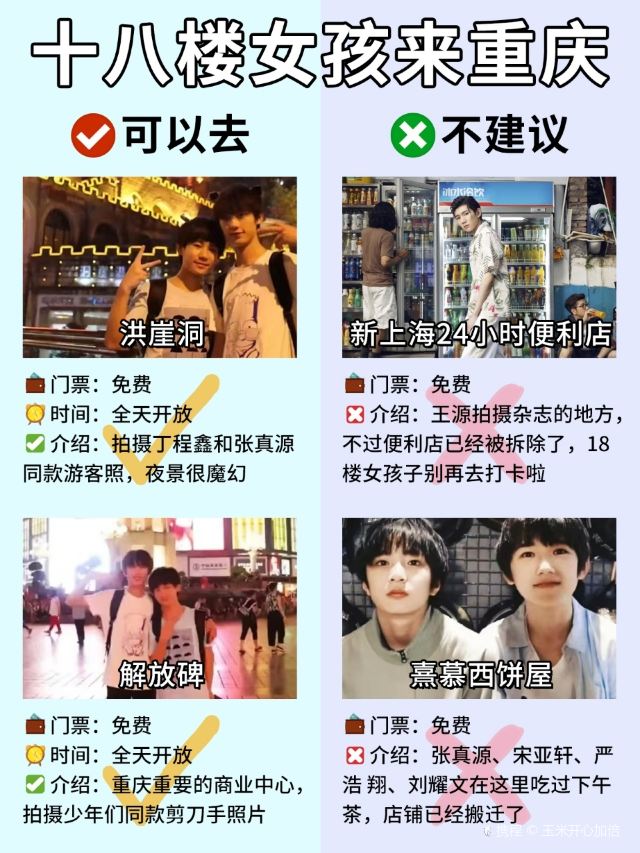 玉米开心加倍十八楼女孩子来重庆,要注意⚠️,好多地方都已经不在了😭😭……为了不让姐妹们白跑一趟,特地整理了这篇十八楼重庆景点打卡合集‼️拍照包出片的!!嘿嘿😀 _ ⚠️不建议去打卡的重庆景点 🔵新上海24小时便利店(王源拍摄杂志的地方,不过便利店已经被拆除了😭) 🔵熹慕西饼屋(张真源、宋亚轩、严浩翔、刘耀文在这里吃过下午茶✨,店铺已经搬迁了) 🔵得意世界(马嘉祺唱《小星星》的地方,虽然地方还在,但是同款路碑已经被拆除了) 🔵华生园梦幻城堡(三小只拍《魔法城堡🏰》 MV取景地!不建议手残党去) _ 🧩十八楼女孩子重庆打卡地 🏠洪崖洞:拍摄丁程鑫和张真源同款游客照 🏠解放碑:拍摄少年们同款剪刀手照片📷 🏠李家沱码头:丁程鑫个人照取景地 🏠鹅岭公园:张真源泡周年写真拍摄地 🏠长江国际:18楼少年👦🏻梦想启航的地方 🏠重庆来福士:拍摄马嘉祺同款来福士🈴影 🏠望江小卖部:MV《一起等雨停》拍摄地 🏠重庆大剧院:贺峻霖过18岁生日的地方 _ 🍡重庆美食打卡地 🍫利火锅 重庆现在很少见的三拖一正宗自选老火锅🍱,现切黄牛肉3.8💰一份,吃起来很有嚼劲 🍫马房湾66号江湖菜 七八十年代的装修风格,适🈴拍照!有辣子鸡🐔、尖椒鸡、招牌鱼等菜品,特别下饭 🍫仪表厂火锅 庆藏得很深的火锅馆,特色就是大锅猪蹄,5.8💰一份,个头特别大,口感软糯 🍫聂发财来凤鱼 深受本地人喜欢的江湖菜,还上过央视哦!来凤鱼🐟是店内的招牌,鱼肉滑嫩,口味鲜甜 🍫丁孃孃火锅 在解放碑、洪崖洞、观音桥附近都有店,人气火爆!孃孃滑肉鲜嫩入味,香辣过瘾🌶️ _ #本地人做的攻略#重庆吃喝玩乐#美食攻略