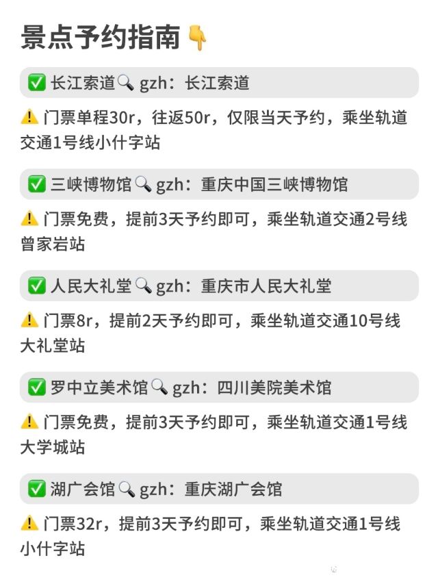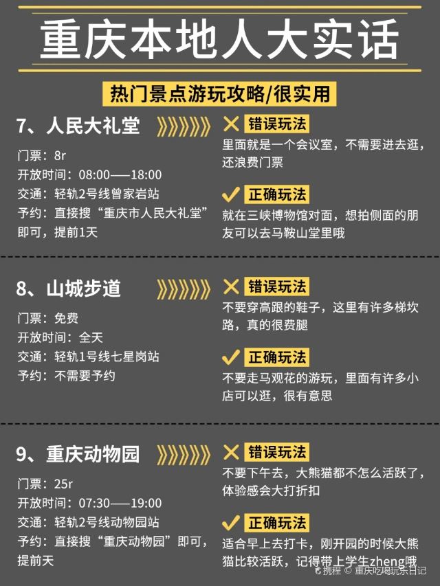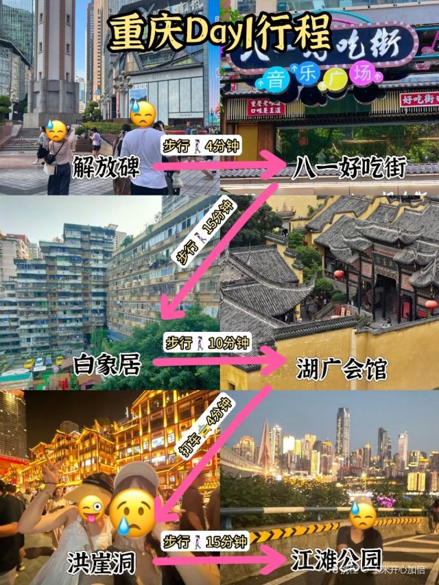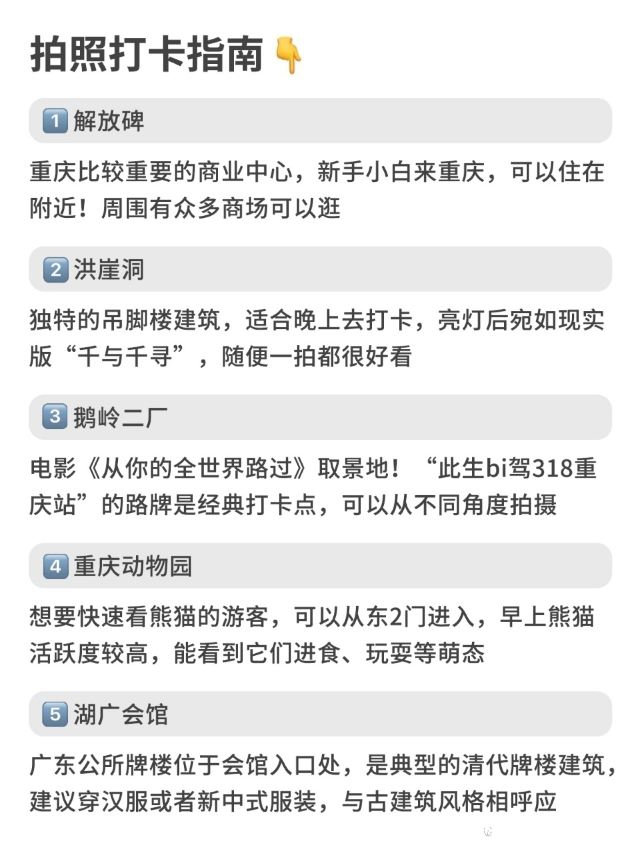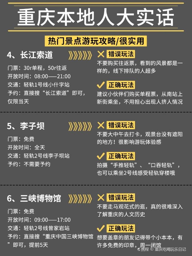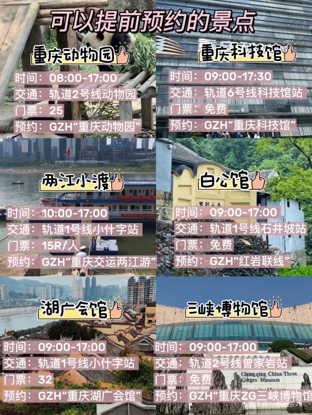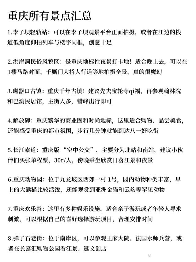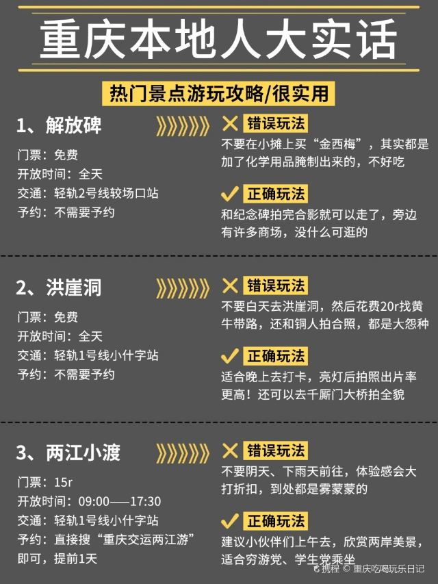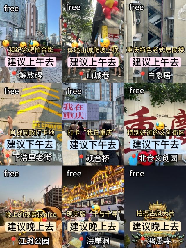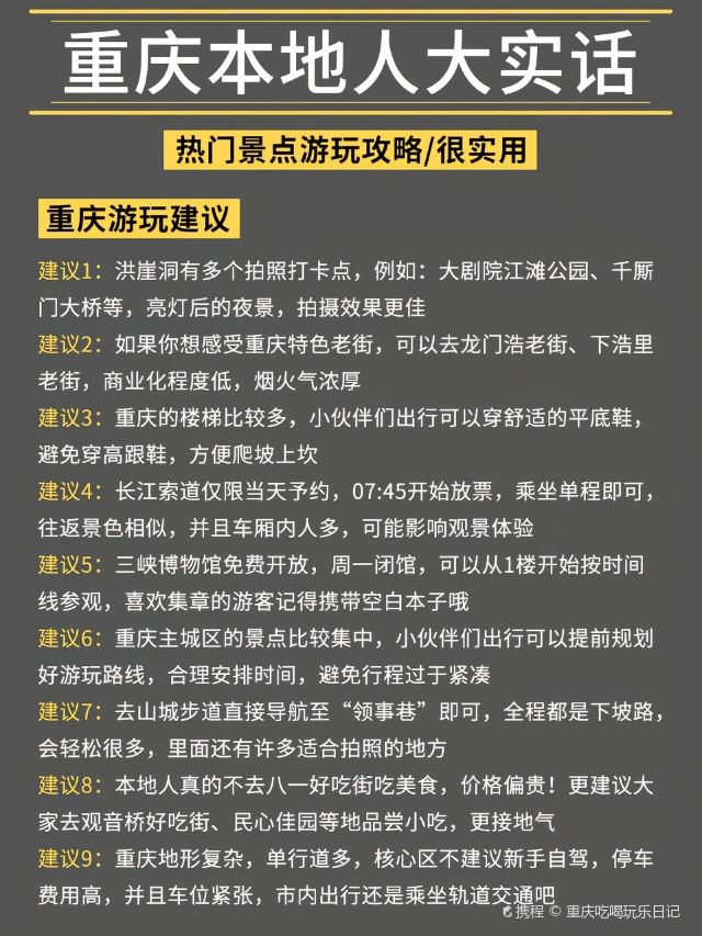 玉米开心加倍求求了🥹🥹!!!11月来重庆旅游,出发前可以看看这篇攻略,涵盖:✅3天旅游路线、景点予约、避雷建议、不踩雷美食……满满都是细节,赶快收藏⭐起来吧❗ - 🗺️重庆懒人版三日游行程 💙day1️⃣路线如下 解放碑>八一好吃街>白象居>湖广会馆>洪崖洞>江滩公园 💙day2️⃣路线如下 鹅岭公园>鹅岭二厂>李子坝轻轨>北仓文创园>塔坪社区>观音桥 💙day3️⃣路线如下 两江小渡>弹子石老街>龙门浩老街>老君洞>南滨路钟楼广场 - 💓来重庆适合发朋友圈的文案 1、人生就像是这轻轨🚈,南来北往,不迷失方向,不辜负生活 2、山与城的牵挂🚠 ,人与江的对白 3、無「辣」🌶️不歡 4、等洪崖洞点灯,等童话入梦🌙 5、山城很好 就是费腿🚶 6、穿越两江的风,把8D魔幻折叠进4分钟🕰️的空中漫游 - 🍣重庆美食(本地人倾情分享) 📅利火锅:重庆院坝火锅,138💰买8荤送13素,串串虾特别新鲜, Q弹十足 📅仪表厂火锅:需要爬坡上坎⛰️才能吃到,隐藏的很深!大锅猪蹄软糯入味,多吃不腻人 📅陈婆婆火锅:性价比超高!现切牛肉3.8💰一份,品质高,裹满辣油🌶️真的好香 📅丁孃孃火锅:周边环境好,建议点孃孃手工系列的菜品,有金钱肚、嫩肉片等,种类丰富 📅马房湾66号·江湖菜:七八十年代的装修风格,适合拍照📸!辣子鸡香辣味十足 - #重庆三日游#重庆旅游攻略#重庆火锅